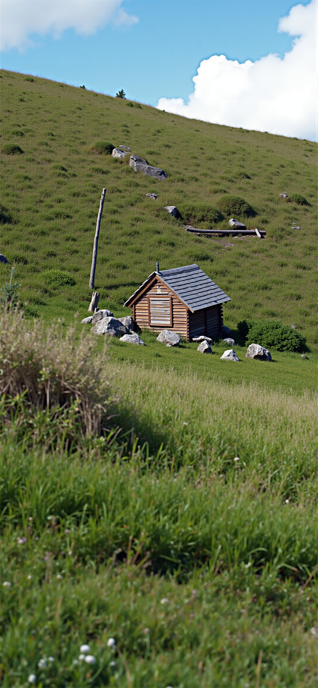 一张小木屋依偎在长满草的山坡上的照片。小屋用浅棕色的木板建造,屋顶是深灰色的。它坐落在一个平缓的斜坡上,上面覆盖着生机勃勃的绿草,周围散布着大片的岩石。在背景中,山一直向上延伸到它的顶峰,而明亮的蓝天和蓬松的白云填充了图像的上部。这个场景唤起了一种宁静孤独的感觉,以及在大自然中简单生活的美好。