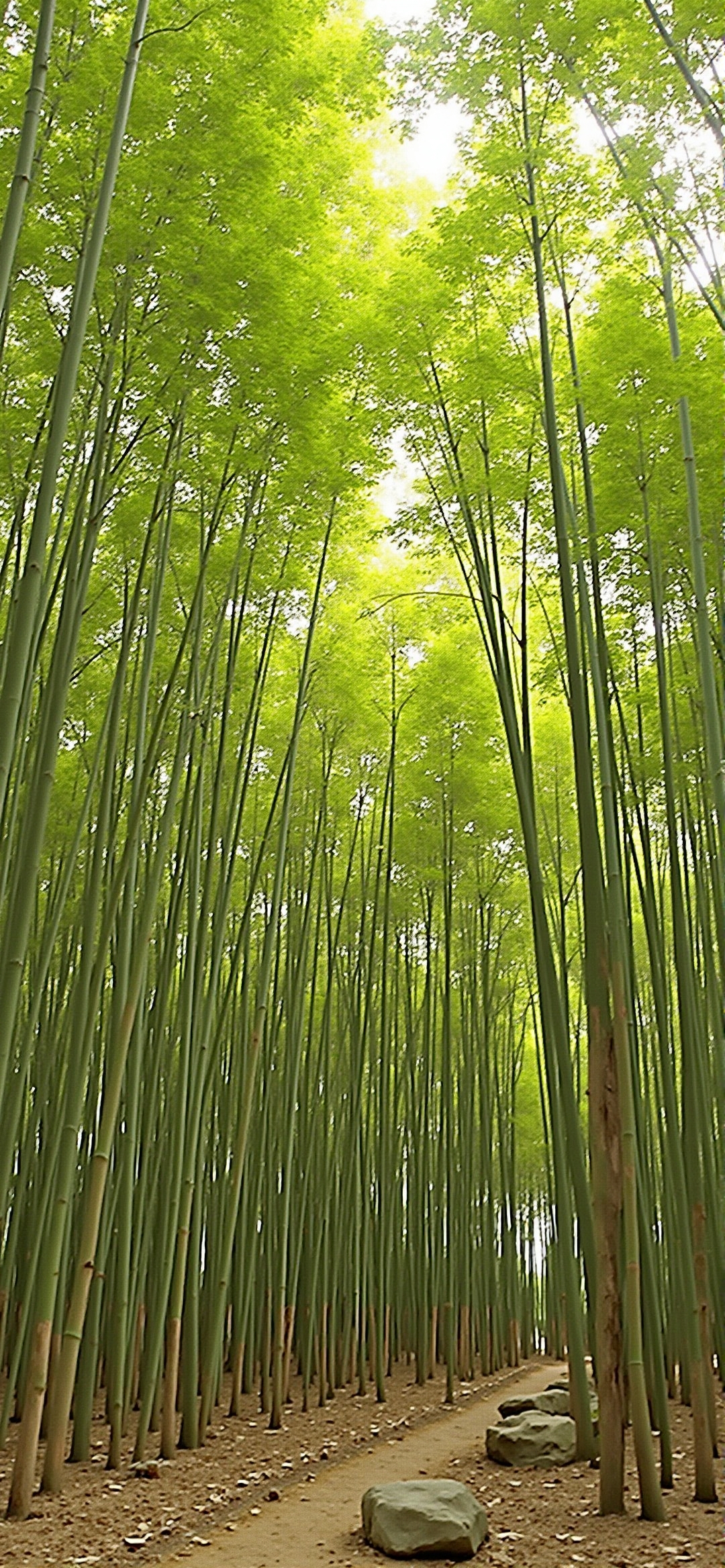 宁静的竹林小径的照片。这张照片是从低角度向上拍摄的,强调了竹竿的高度和密度。这条被落叶覆盖的小路蜿蜒穿过森林,邀请观众深入探索。沿着小路放置的两块大石头增加了宁静和沉思的氛围。竹子和树叶充满活力的绿色色调唤起了一种宁静与自然和谐的感觉。阳光通过树叶的过滤产生了斑驳的灯光效果,增加了图像的深度和维度。