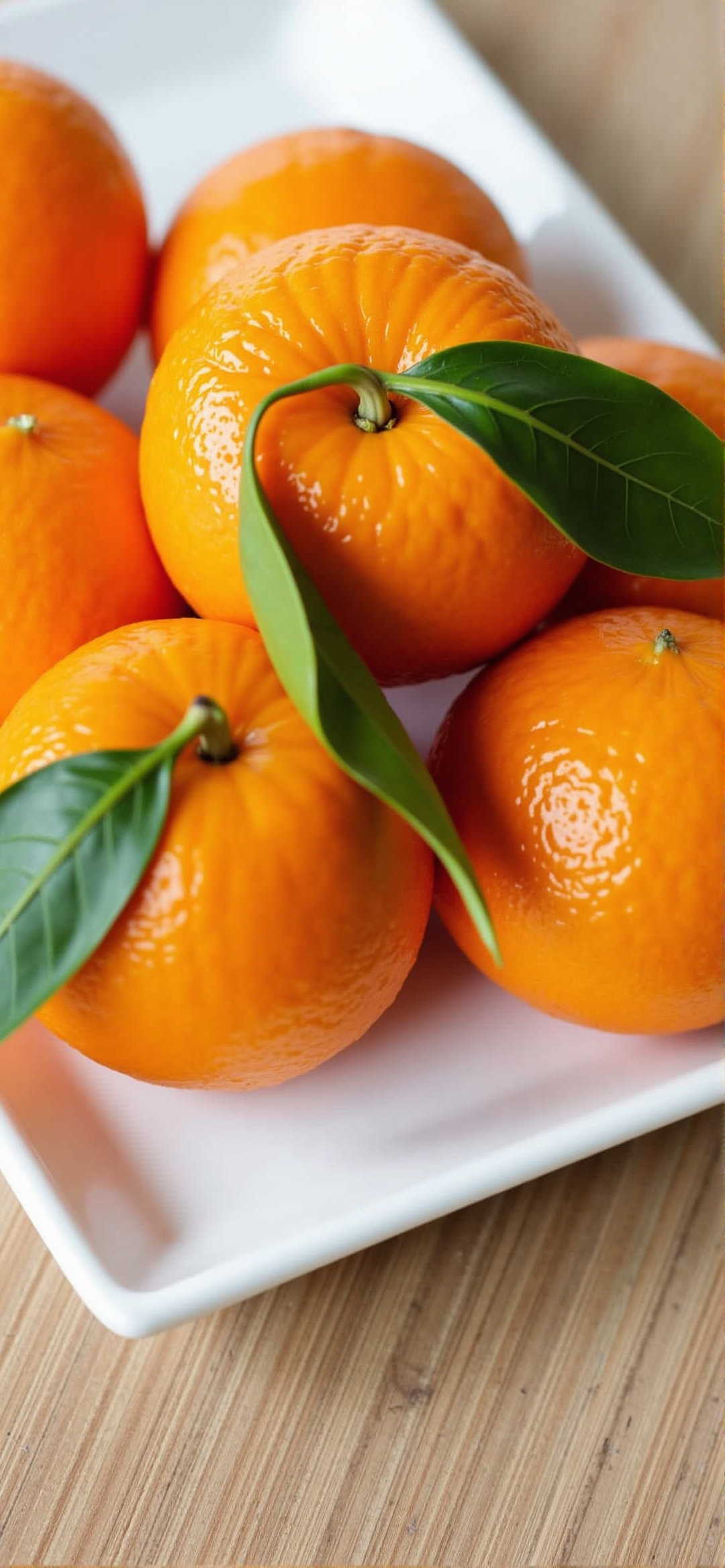 白色矩形盘子上摆放着一簇新鲜橘子的照片。橘子是充满活力的橙色,表皮光滑光滑。其中有几棵树还附着着绿叶,为构图增添了一丝清新。盘子被放置在浅棕色的木质表面上,提供了一个中性的背景,强调了水果的明亮颜色。特写镜头和浅景深将人们的注意力吸引到橘子的质地和细节上,使它们显得饱满多汁。