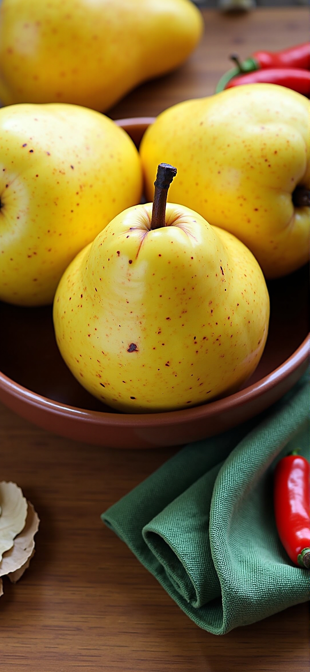 四个生机勃勃的黄梨巧妙地排列在一个质朴的棕色碗里。梨子光滑光滑,表皮上点缀着精致的红色斑点。在前景中,一个梨占据了中心位置,它的茎直接指向观众。温暖、诱人的灯光突出了梨的纹理和下面桌子的木纹。一张丰富的绿色餐巾纸随意地披在前景中,为构图增加了一点色彩对比。背景中的两个焦外红辣椒暗示着辛辣的烹饪体验。