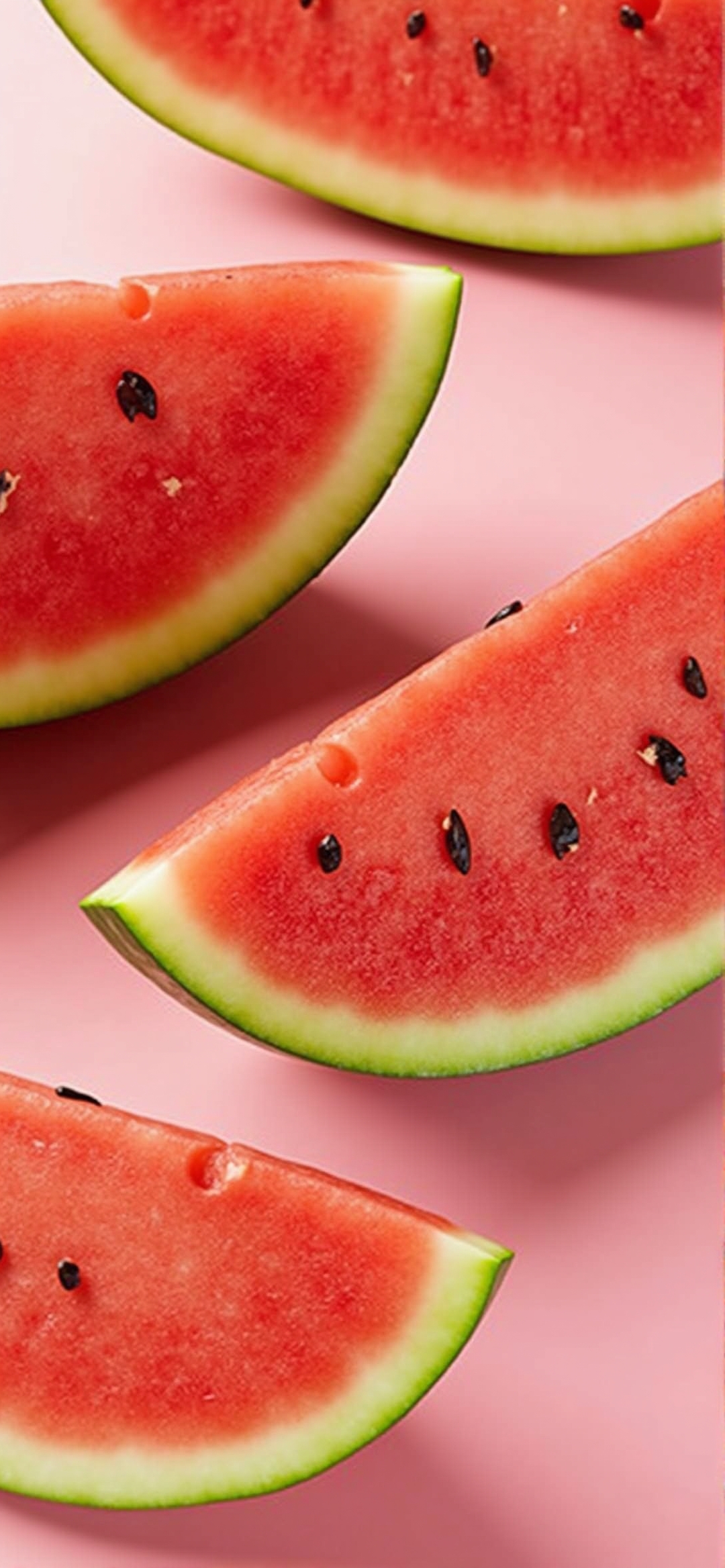 粉红背景下的四级切片西瓜摆拍:鲜艳红肉、黑籽与绿皮交相辉映