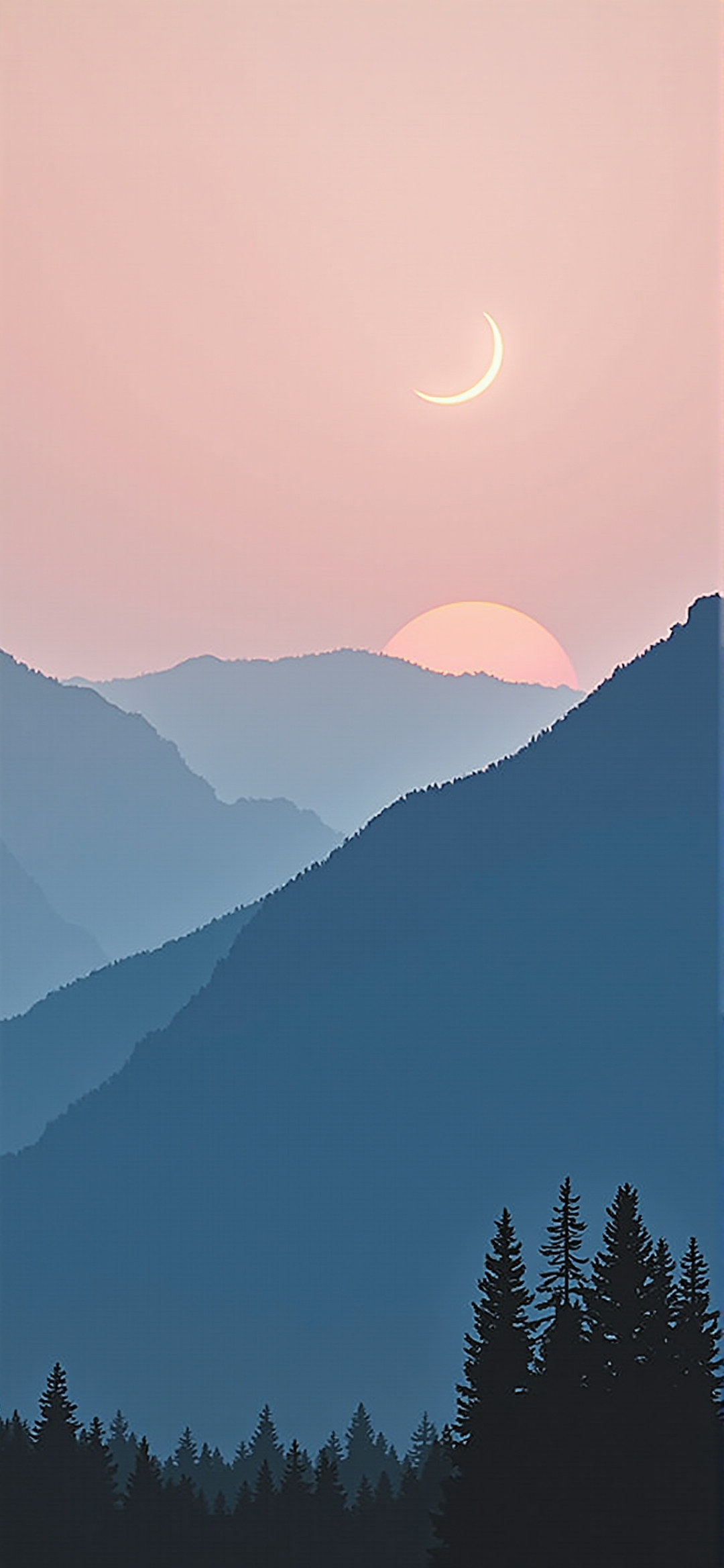 简约风格山川日落渲染图:暖阳映照粉蓝天空,新月苍松营造宁静美景