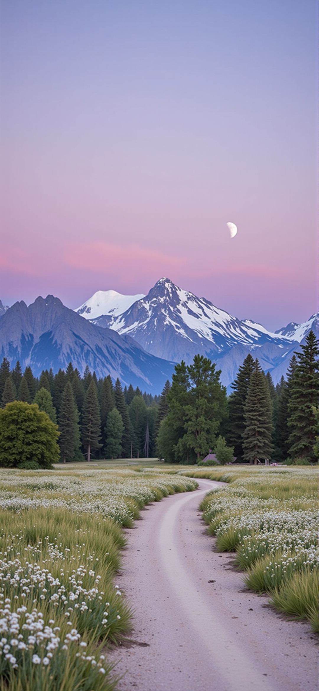 黄昏时宁静的山景照片。一条土路蜿蜒穿过白色野花的田野,通向高耸的雪山脚下的茂密森林。天空被粉红色和紫色的柔和色调所淹没,右上角可以看到一轮新月。这幅画唤起了一种宁静的感觉和令人敬畏的自然之美。