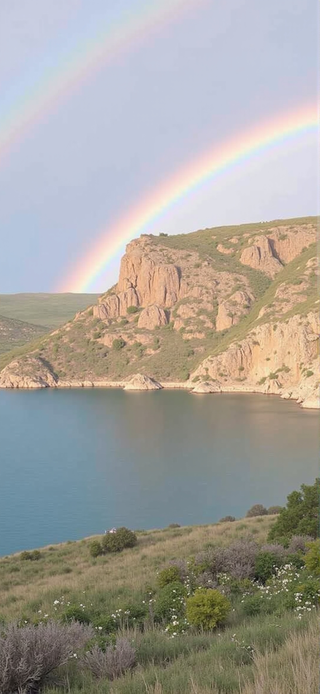 一张宁静的风景照片,其中有一个宁静的湖泊坐落在连绵起伏的群山中。一个充满活力的双彩虹弧线优雅地穿过天空,从图像的左侧延伸到右侧。覆盖着稀疏植被的山丘从湖边缓缓升起,露出地面的岩石为景色增添了质感。水是一种迷人的绿松石阴影,反映了天空的颜色。前景由点缀着野花的草坡主导,将观众的目光引向远处的山丘和令人惊叹的彩虹。这幅画唤起了一种和平与宁静的感觉,捕捉到了大自然的美丽。
