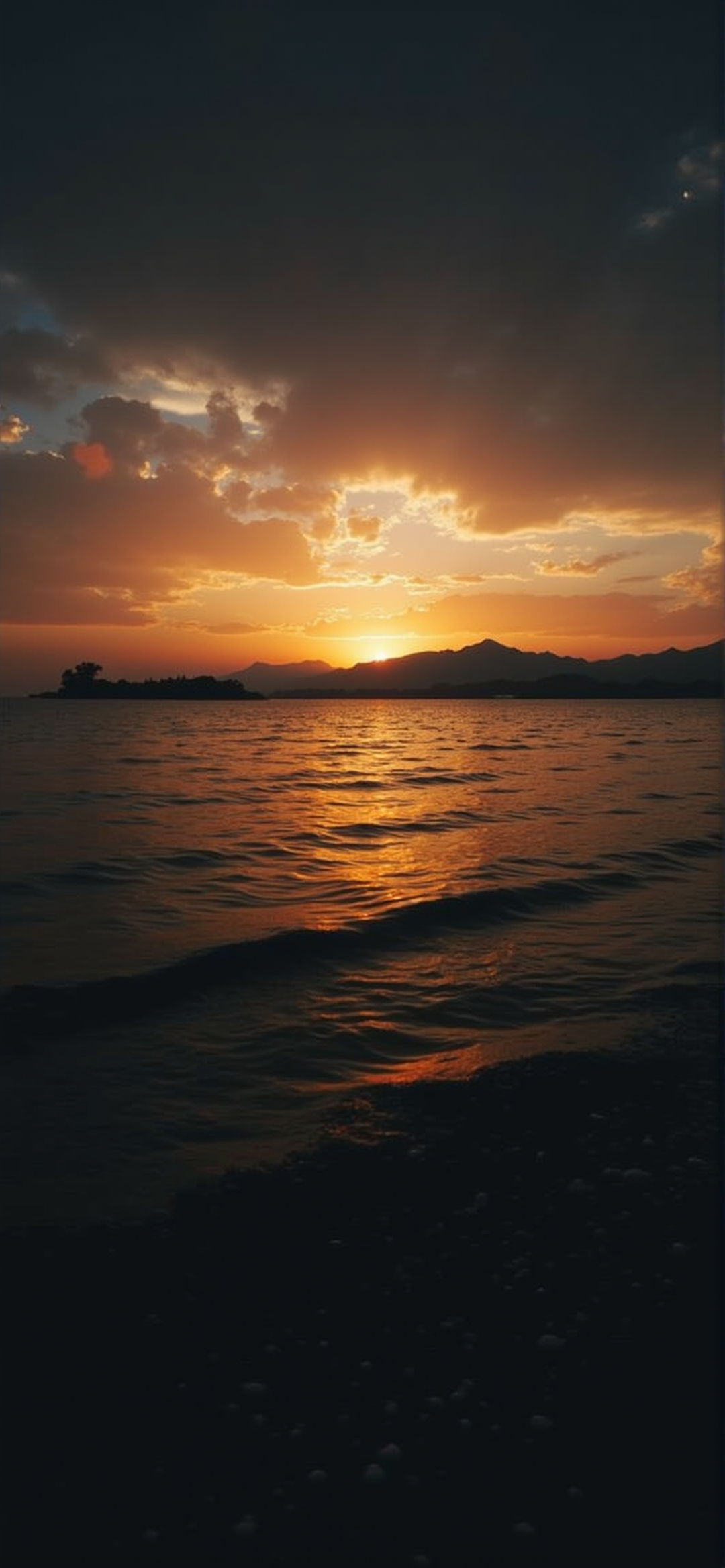 平静的水面上生动的日落的照片。夕阳被一层云遮住了一部分,在天空中投射出温暖的橙色和红色。水面反射出天空的颜色,创造出一种迷人的光影相互作用。远处可以看到一个小岛的剪影,增加了画面的深度和尺度感。这张照片的前景是黑暗的,只有一点海岸线可见。
