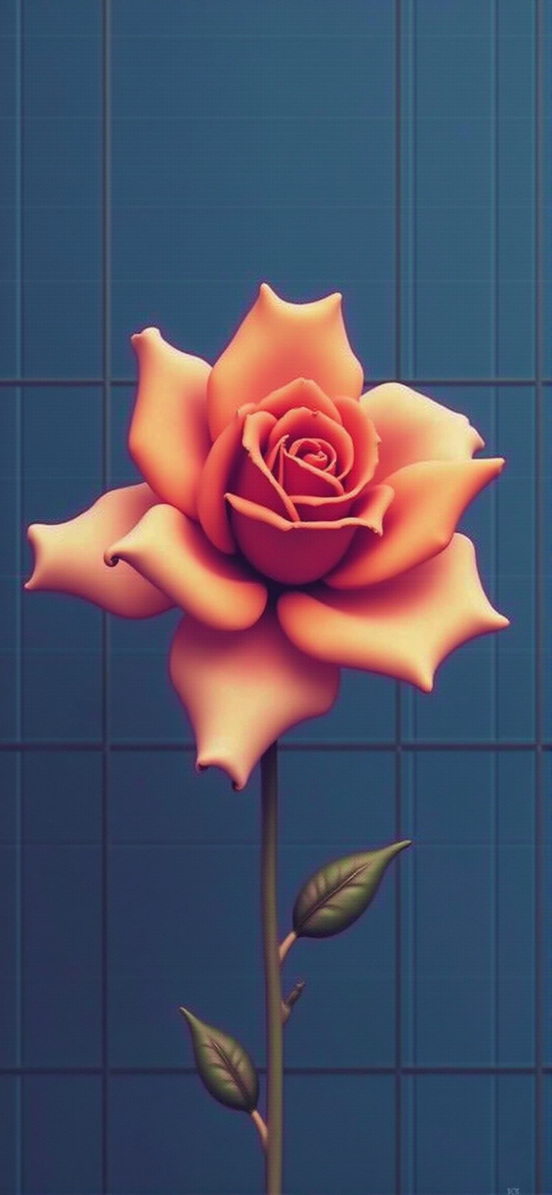 简约风格卡通玫瑰画作,几何蓝背景凸显橙色花朵生动姿态