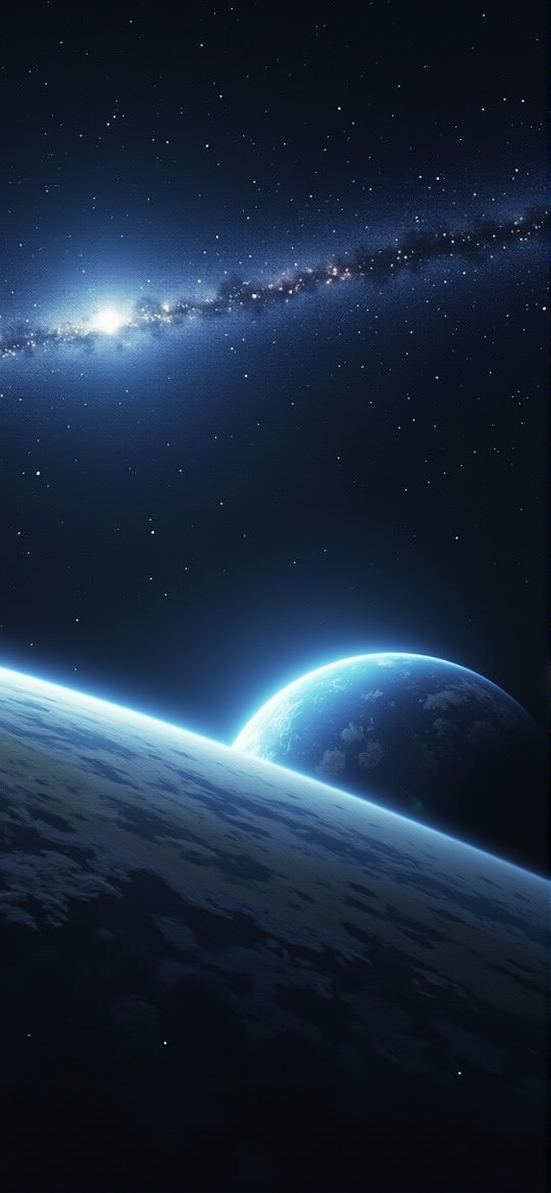 天空景观的渲染图像。从太空的有利位置,这张照片捕捉到了一颗行星的曲线,它的蓝色大气层被一颗明亮的恒星照亮,部分被行星的曲率遮挡。上图中,一个星系的漩涡在深空的背景下伸展,其间点缀着无数的恒星。调色板主要是冷蓝色和黑色,传达了宇宙的浩瀚和神秘。该图像利用数字渲染技术来创造一种深度和真实感。