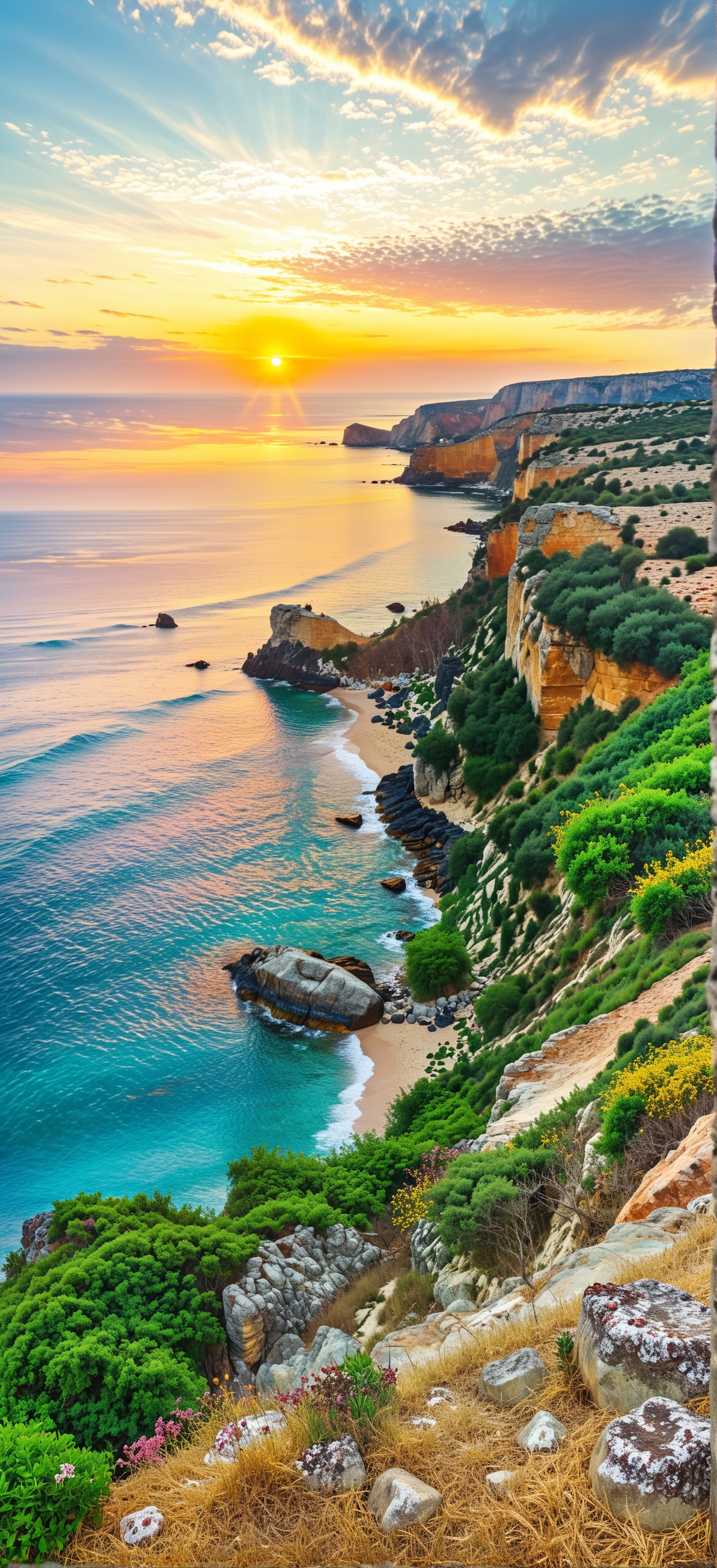 日落时令人惊叹的海岸景观的照片,从高处拍摄。这个场景展示了崎岖的悬崖,点缀着郁郁葱葱的绿叶和小灌木丛。金色的太阳正落在地平线上,把橙色和粉红色的暖色调投在天空上,反射在下面平静的绿松石般的水面上。破碎的海浪温柔地亲吻着点缀着大块岩石的沙滩海岸线。该图像提供了丰富的色彩对比,高清晰度和宽景深,增强了这宁静海景的自然美。