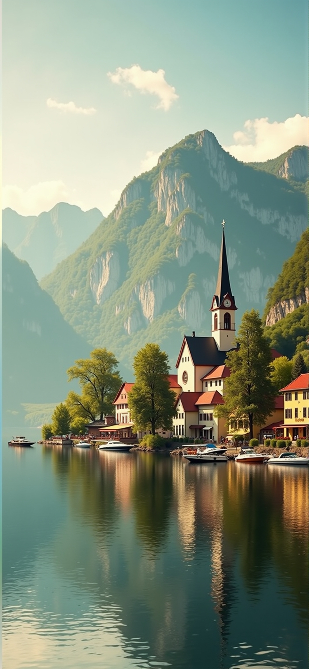 这是一张风景如画的村庄的照片,它坐落在高耸翠绿的山脚下。一个宁静的湖泊,反射着清澈的天空,延伸到前景,几艘小船在水面上轻轻地摆动。这个村庄的特点是迷人的房屋,色彩缤纷的外墙,聚集在一个有高高的尖顶的著名教堂周围。这幅画唤起了一种宁静和永恒的美感,让人想起经典的山水画。温暖的阳光沐浴在金色的光芒中,增强了整体的田园氛围。