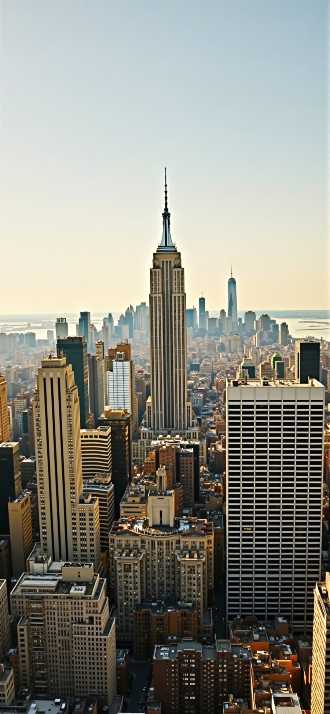 从高处拍摄的标志性的纽约市天际线照片。帝国大厦耸立在市中心,周围是密集的摩天大楼群。这张照片捕捉到了城市的广阔,不同高度和建筑风格的建筑物延伸到地平线上。背景中可以看到东河,它将曼哈顿与皇后区和布鲁克林区分隔开来。这张照片温暖而朦胧,表明它是在一个阳光明媚的日子里拍摄的,有一些大气扩散。构图强调了城市景观的垂直性,创造了一种敬畏和宏伟的感觉。
