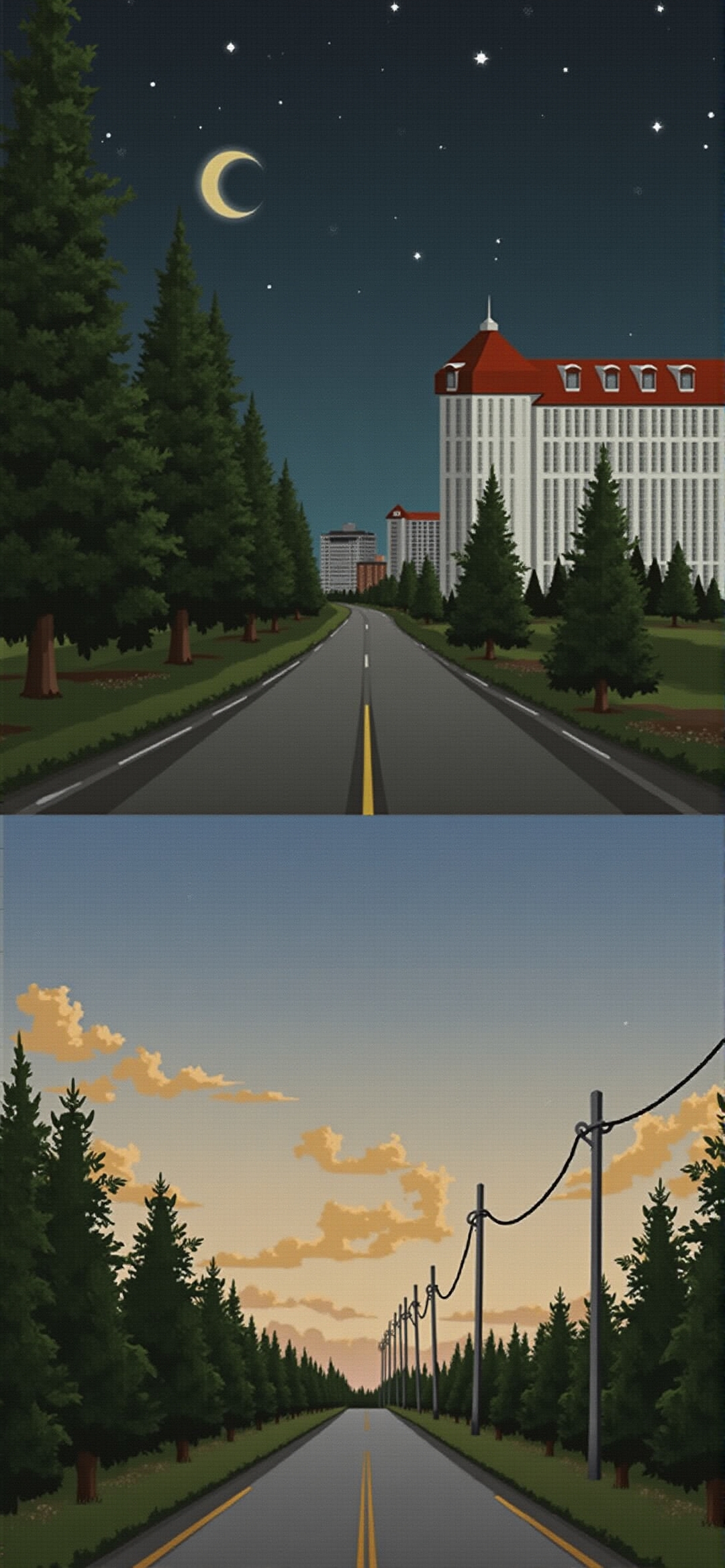 两个独立的道路场景垂直堆叠的渲染图像。最上面的图片描绘了通往一家大酒店的高速公路的夜景。酒店是白色的,有红色的屋顶和多层。一轮新月挂在海军蓝的天空上,常青树排列在路边。下面的图片是一条高速公路的日间视图,公路两旁排列着常青树,电线杆一直延伸到远处。这条路通向一个消失点,太阳落在云层后面,在地平线上投下温暖的光芒。这两幅图像都以程式化的图形艺术风格呈现,具有简化的形状和平坦的颜色。