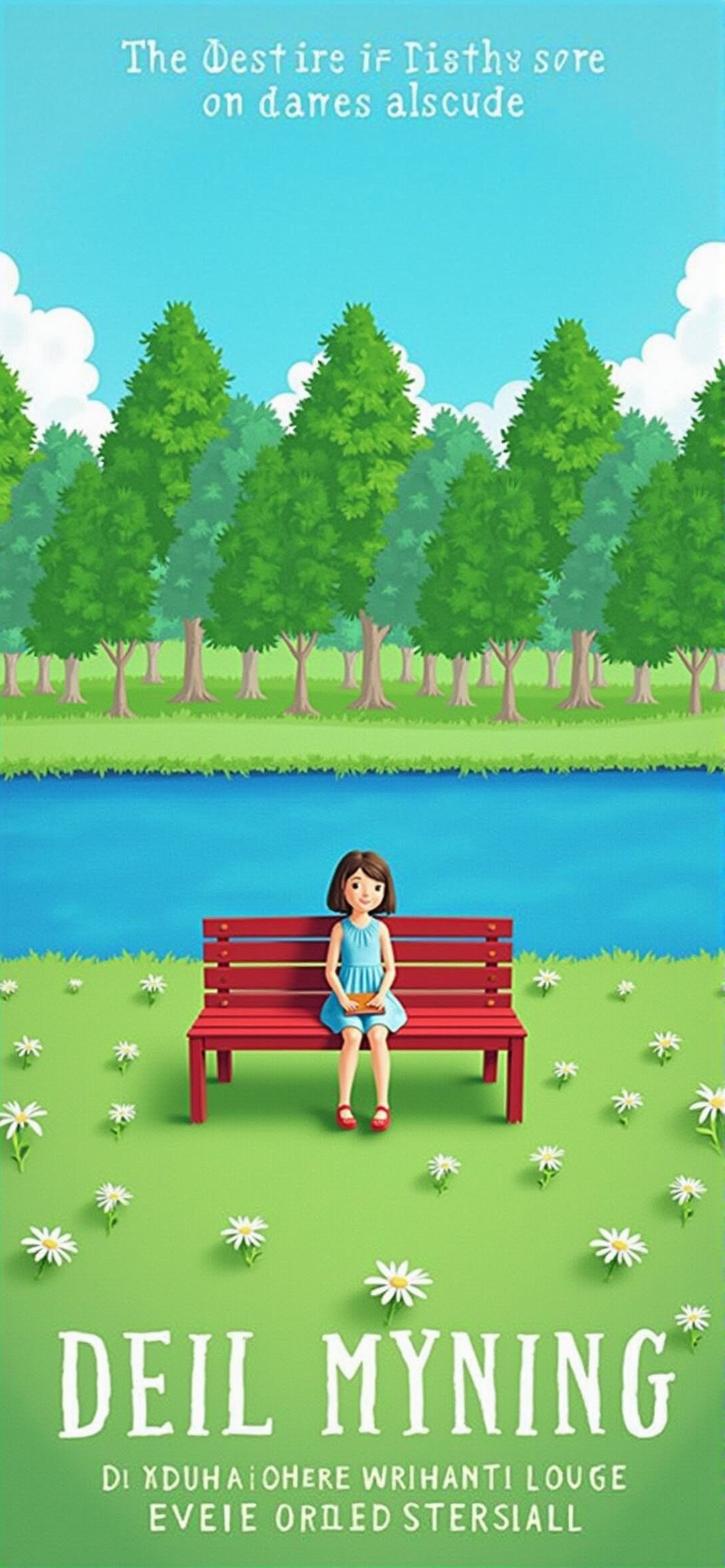 儿童书籍封面的渲染图像。这幅画描绘了一个棕色头发、穿着蓝色裙子的年轻女孩,她坐在红色的长凳上,腿上放着一本书。她面无表情地面对着观众。长椅坐落在一片点缀着白色雏菊的草地上,旁边是一条蓝色的河。在长凳后面,一排风格化的绿树横贯画面。天空是明亮的,令人愉快的蓝色。这本书的标题是《魔鬼明宁》(devil MYNING),在底部的绿草地上醒目地用有趣的白色大字写着。作者的名字和副标题用白色的小字印在标题下面。整体风格异想天开,色彩鲜艳,可能是针对年轻读者的。