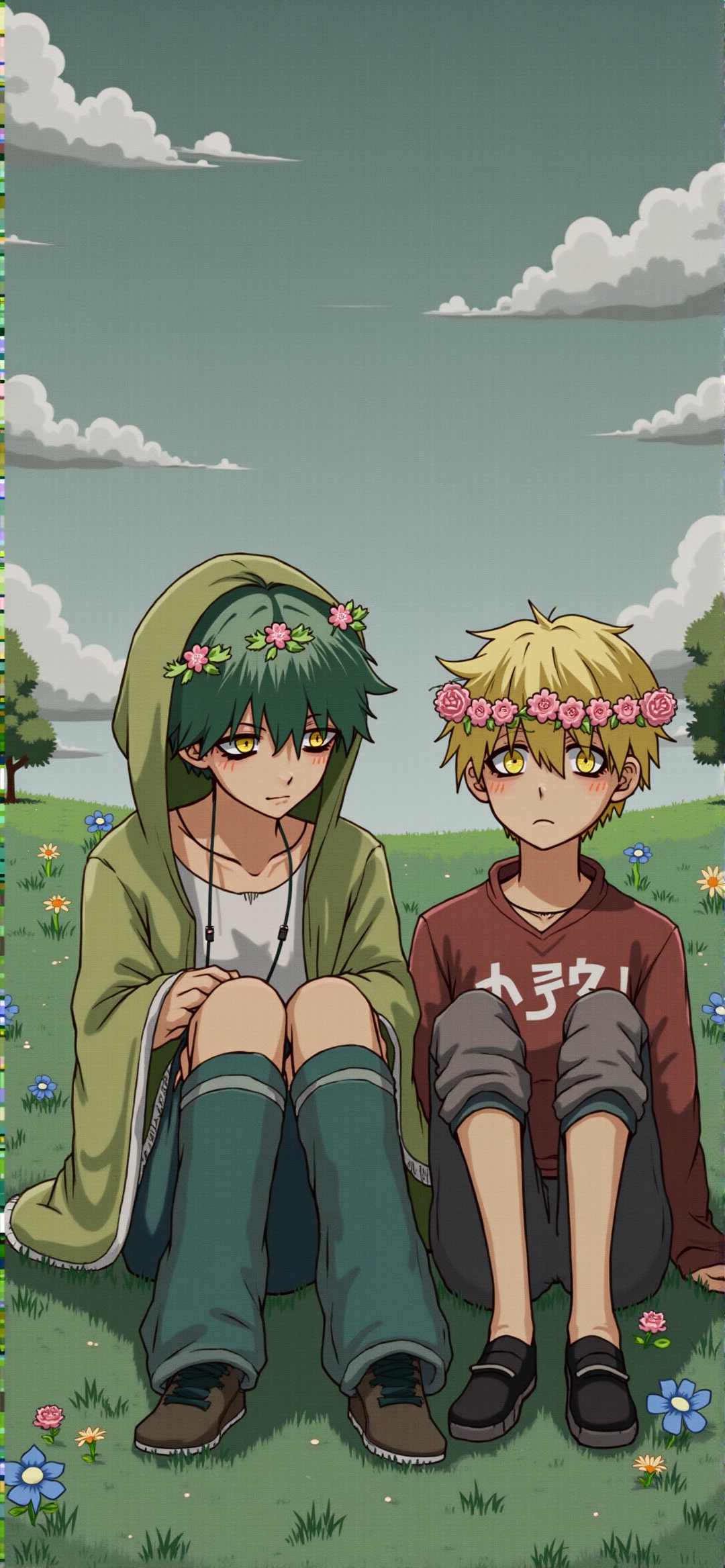两个动漫风格的人物坐在花丛中。第一个角色,在左边,有绿色的头发和黄色的眼睛,穿着一件绿色的连帽夹克,一件白色的衬衫和蓝色的牛仔裤。右边的第二个人物,金发黄眼,穿着有日文的红色衬衫,棕色裤子,黑色鞋子。两个角色都戴着花冠,表情也很中性。背景是多云的天空和一片鲜花。图像具有柔和,柔和的调色板和轻微的颗粒纹理,给人一种复古的感觉。这些人物都是坐着的姿势,膝盖拉到胸前,传达出一种安静的沉思感。