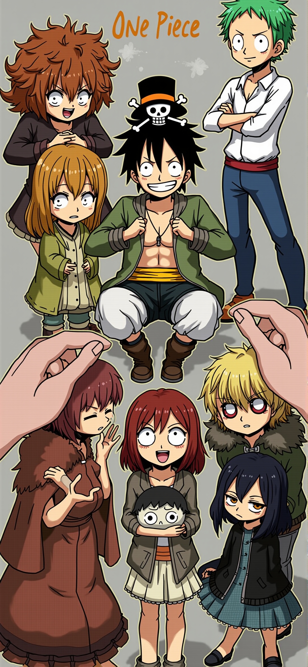 这是一幅粉丝艺术插图,以动漫《海贼王》系列中的人物为特色,将他们重新想象成儿童。这幅画描绘了9个人物,以色彩缤纷、夸张的动漫风格绘制,背景是普通的灰色。标题“海贼王”(One Piece)醒目地写在顶部,字体是橘黄色的。两只没有实体的手被放置在那里,就好像它们在和玩偶一样玩耍。著名的角色包括猴子D.路飞,他的标志性草帽和敞开的绿色夹克,以及罗罗诺阿·佐罗,他的绿色头发和白色衬衫。构图活泼俏皮,强调人物年轻的外表。整体基调是轻松幽默的,旨在为该系列的粉丝。