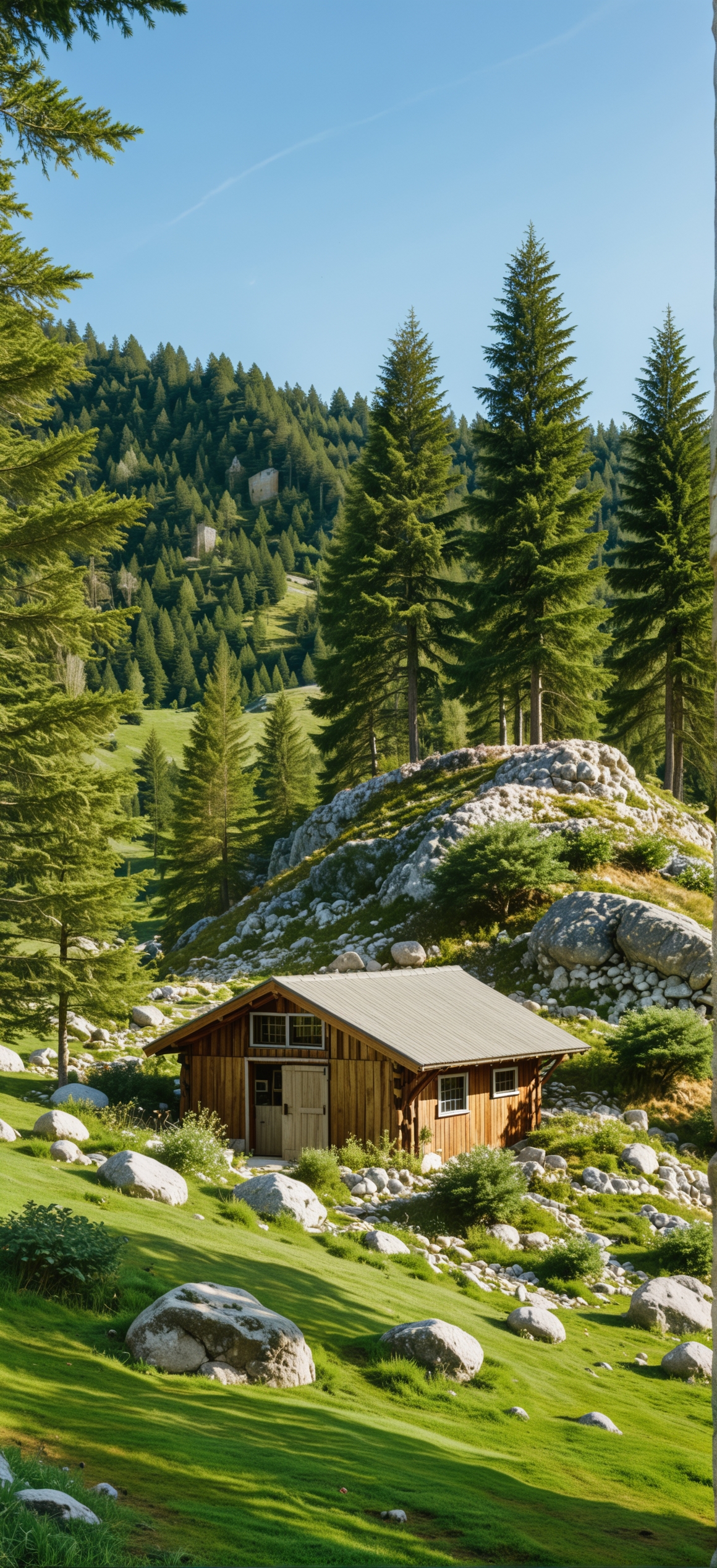 宁静的山区风景,在郁郁葱葱的绿色植物和巨石之间,有一个质朴的小木屋。高高的、青翠的针叶树环绕着小屋,映衬着连绵起伏的山峦和湛蓝的天空。这张照片捕捉到了一个僻静的山坡的宁静之美,自然光照亮了这个场景,突出了岩石地形的纹理和丰富的绿色草地。这幅画散发出一种宁静、田园诗般的氛围,非常适合在大自然中休憩。