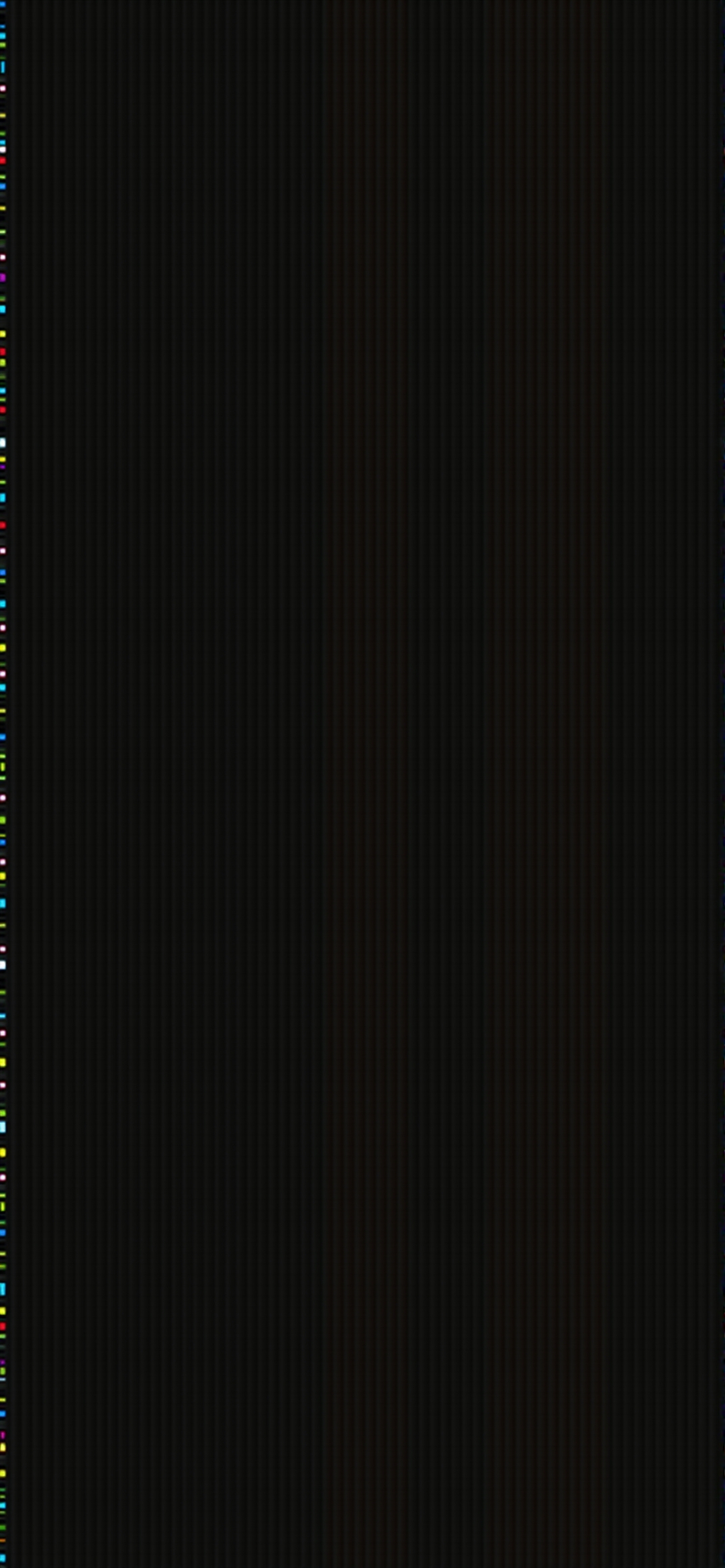 黑色背景的照片,其长度上有细而紧密间隔的垂直线。一条由重复的彩色像素组成的窄带沿着左边缘运行。图像有颗粒状纹理,就像扫描的打印照片或旧电影卷轴的静止图像一样。整体色调很暗,色带暗淡。