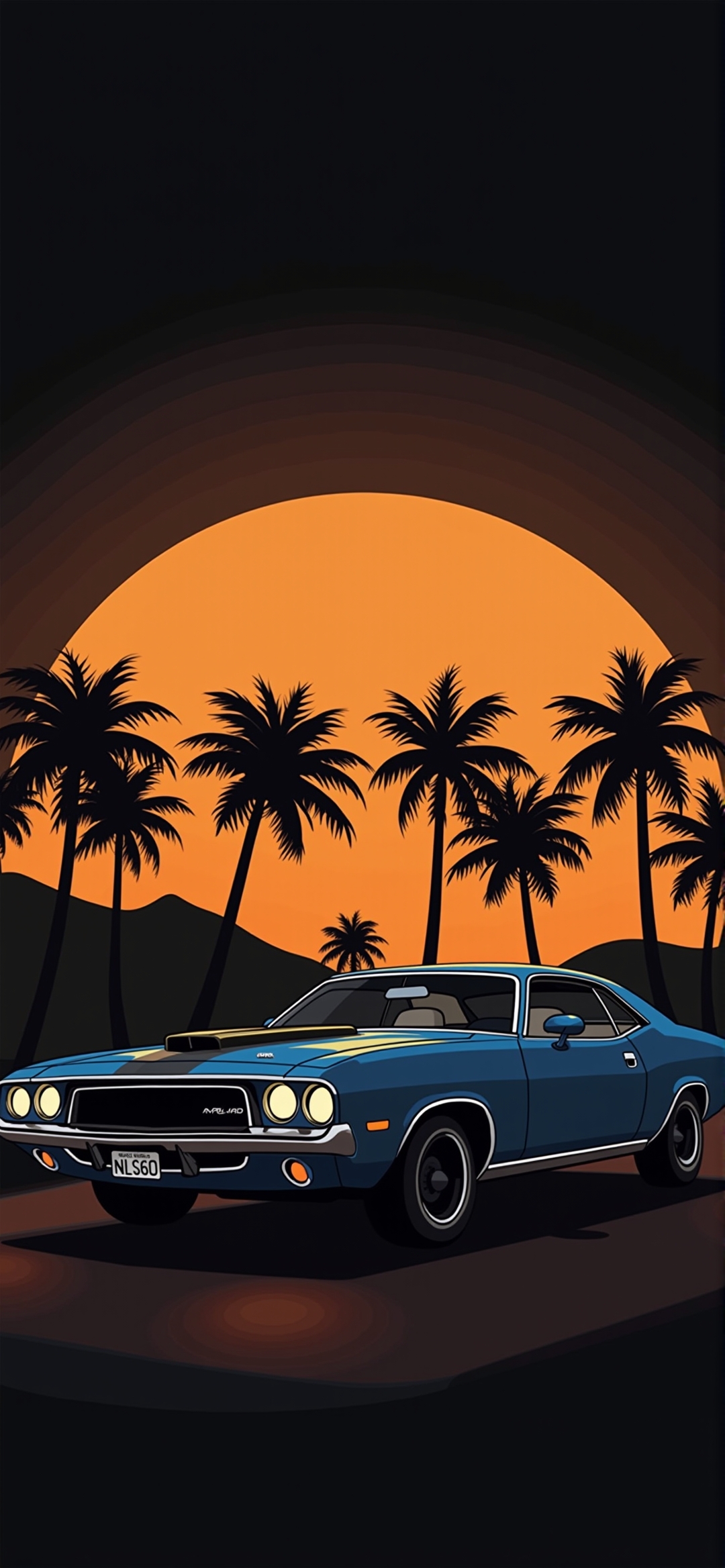 一辆经典的美国肌肉车停在热带日落的背景下。这辆车是一辆蓝色的道奇挑战者,带有金色的赛车条纹,在四分之三的视图中被描绘出来,它的前灯照亮了黑暗的场景。夕阳在背景中勾勒出棕榈树的轮廓和远处的山脉上投射出温暖的橘黄色光芒。插图风格简洁、图形化,强调大胆的形状和颜色,营造出怀旧和酷的感觉。