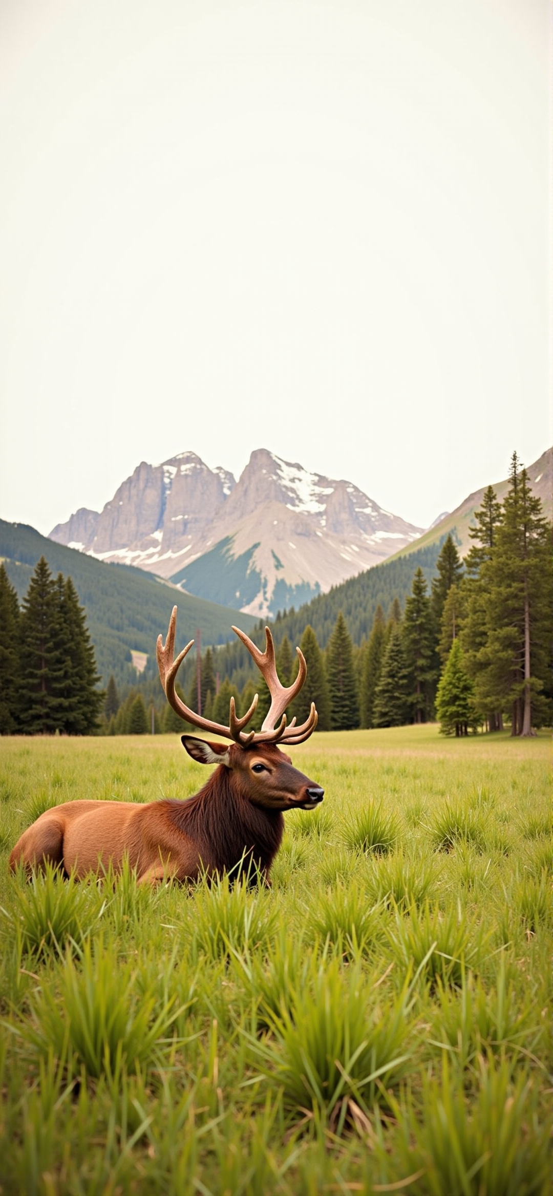 草地雄鹿休憩:巨角棕毛与雪峰蓝调的静谧画面