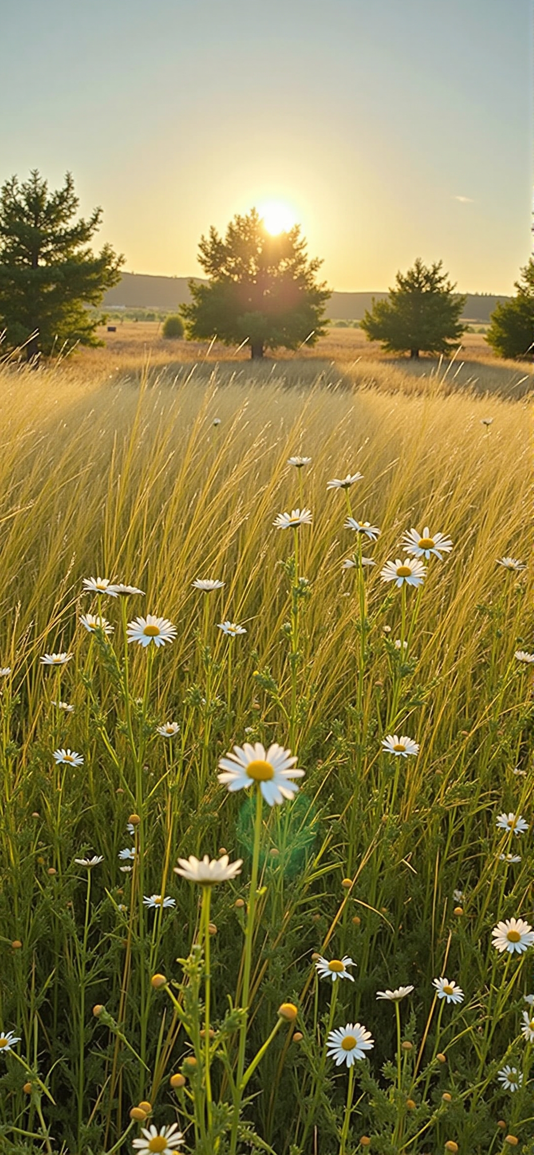 宁静的草地沐浴在夕阳的金色光芒中。低垂的太阳被常青树的剪影遮住了一部分,在高高的金色草地上投下了长长的影子。白色的雏菊散落在草地上,它们娇嫩的花瓣捕捉着温暖的阳光。这张照片有一种宁静、田园诗般的气质,捕捉到了一天结束时大自然的美丽。色调以温暖的黄色和橙色为主,营造出一种温暖和宁静的感觉。