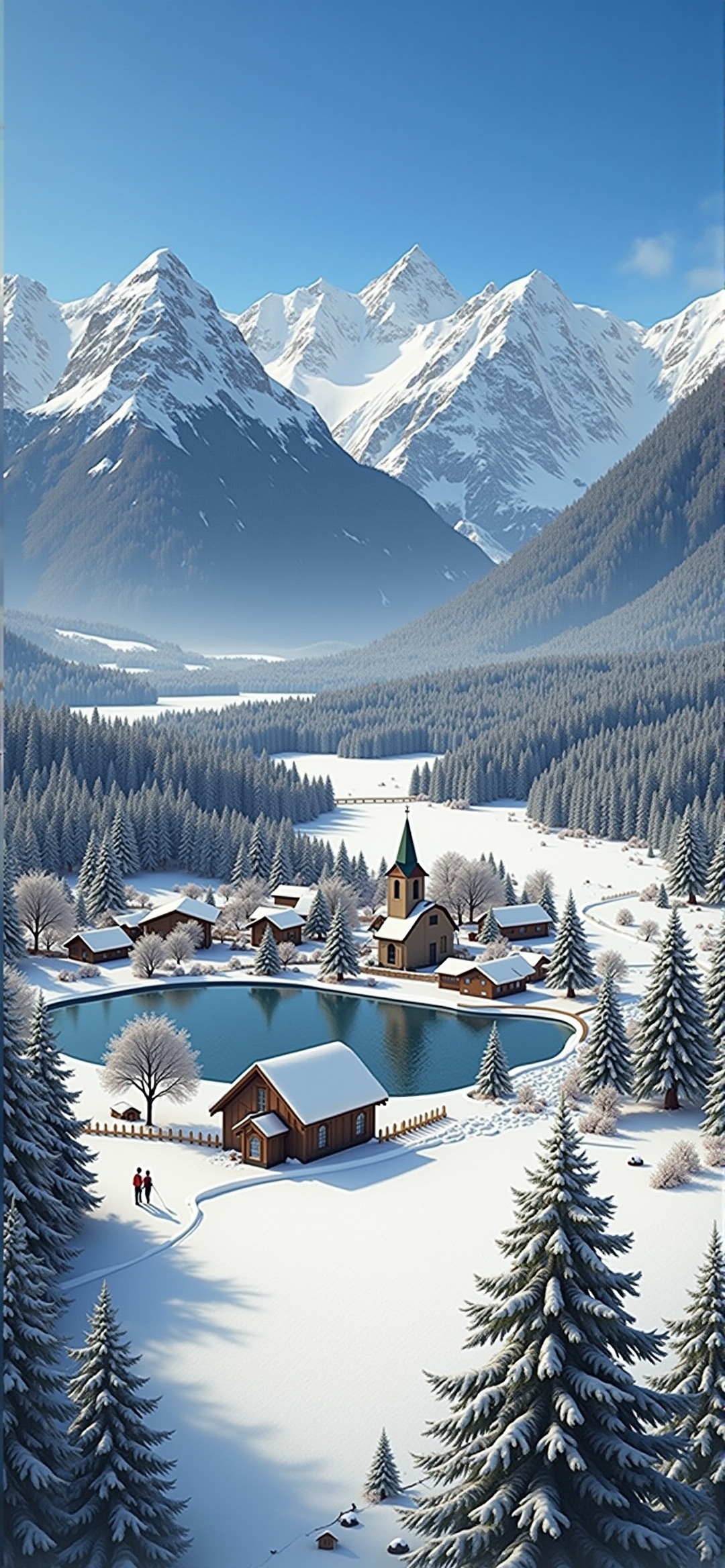 一个被白雪覆盖的村庄坐落在一个山谷里,周围是高耸的雪山。村庄的中心是一个原始的、冰冻的湖泊,湖面反射着蔚蓝的天空。古雅的木屋点缀着白雪覆盖的屋顶,点缀着被大雪覆盖的常青树。一座迷人的教堂高耸的尖顶矗立在湖边,其温暖的黄色立面与周围的白色形成鲜明对比。两个穿着冬装的人沿着积雪覆盖的小路走向湖边,他们的出现为宁静的景色增添了一丝生机。这幅画唤起了一种和平、宁静的感觉,以及冬季仙境的神奇魅力。