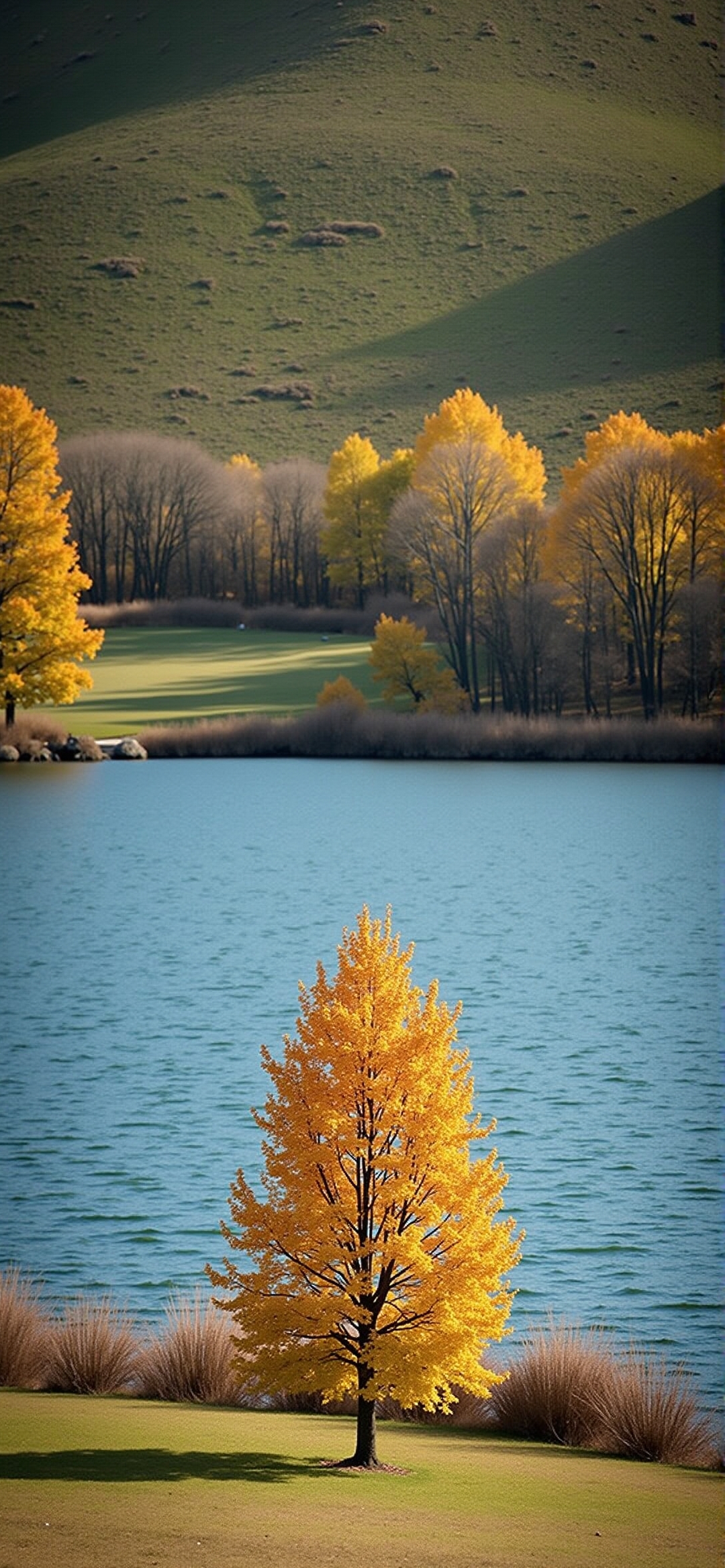 金秋独株白杨树湖畔映画:金黄叶色与远山碧空交织的宁静 depth (考虑到搜索引擎优化和吸引力,我稍微调整了一下标题,使之包含了视觉美感、季节特色和画面深度元素)