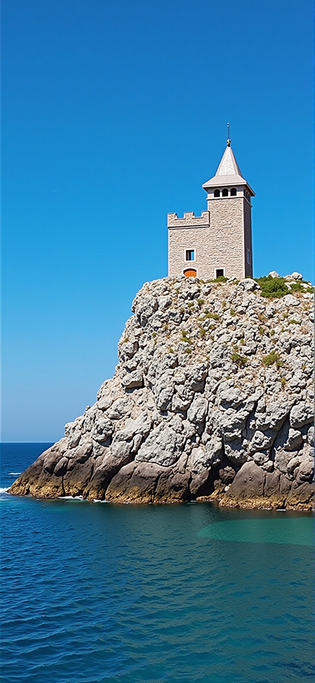 孤石塔耸立悬崖之上:俯瞰宁静水域的古朴壮丽风光