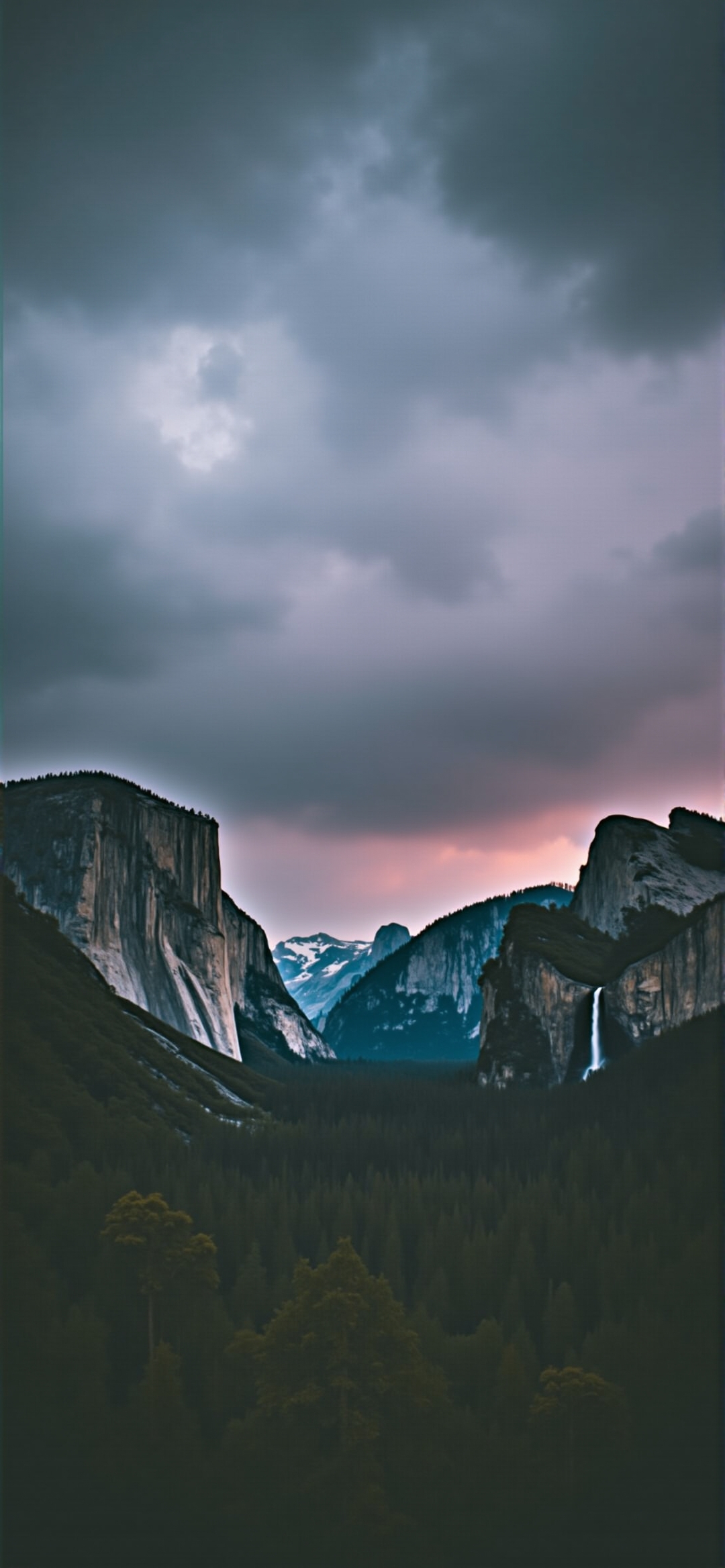 约塞米蒂国家公园里一个戏剧性的、阴暗的山谷景象。高耸的花岗岩悬崖在两边拔地而起,部分被布满云的黄昏天空的柔和的粉红色所照亮。茂密的常青树覆盖着山谷的地面,与陡峭的岩壁形成鲜明的对比。一条细细的瀑布从右边的悬崖边缘倾泻而下,落入下面的黑暗中。图像的整体情绪是令人敬畏和宁静的,捕捉到大自然的宏伟和威严。