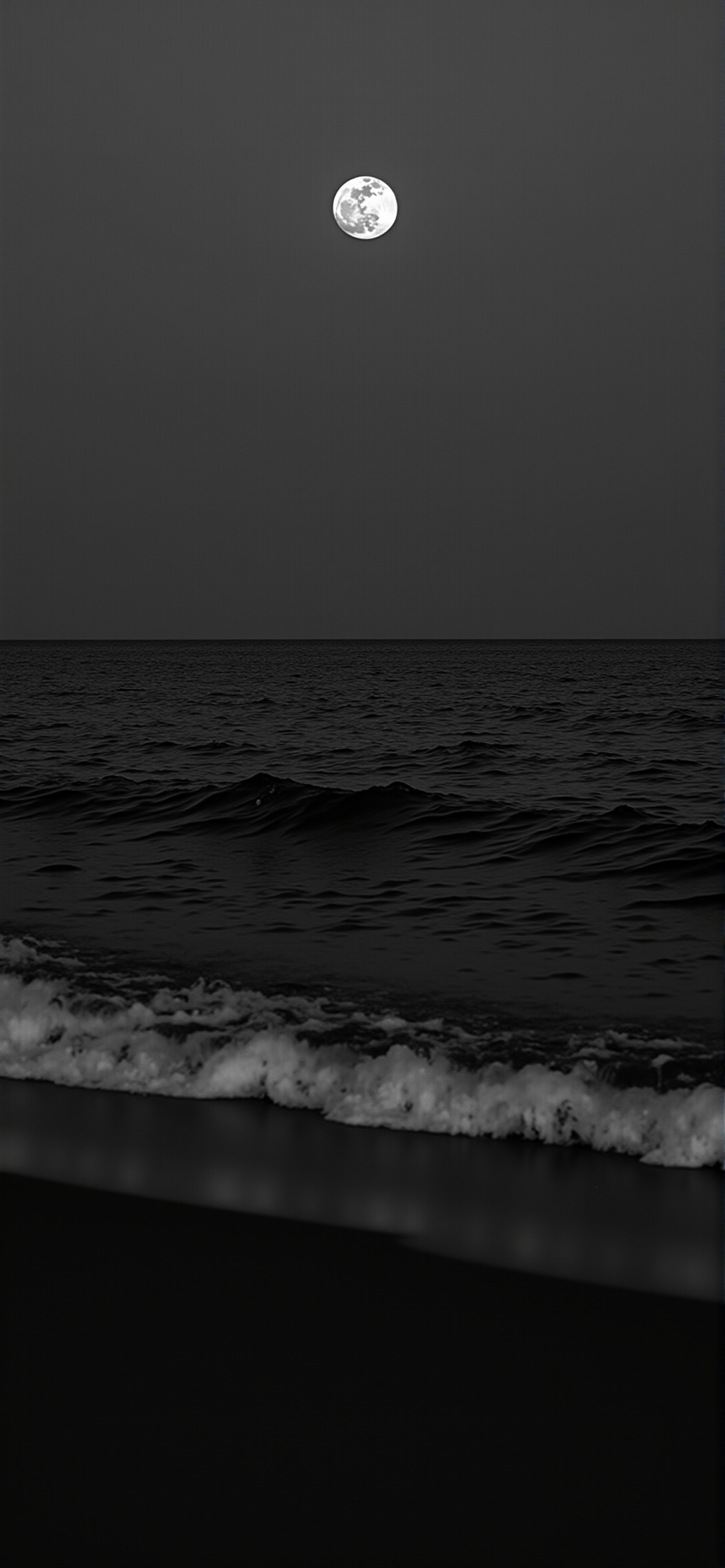 月光下的海景照片。画面以黑色为主,白色的满月衬托着黑色的天空。月亮高高挂在画面中,正对着平静的大海。温柔的海浪轻轻地拍打着海滩,边缘被白色的泡沫所衬托。照片的下三分之一是一片黑暗的海滩。这张照片唤起了一种宁静和孤独的感觉。