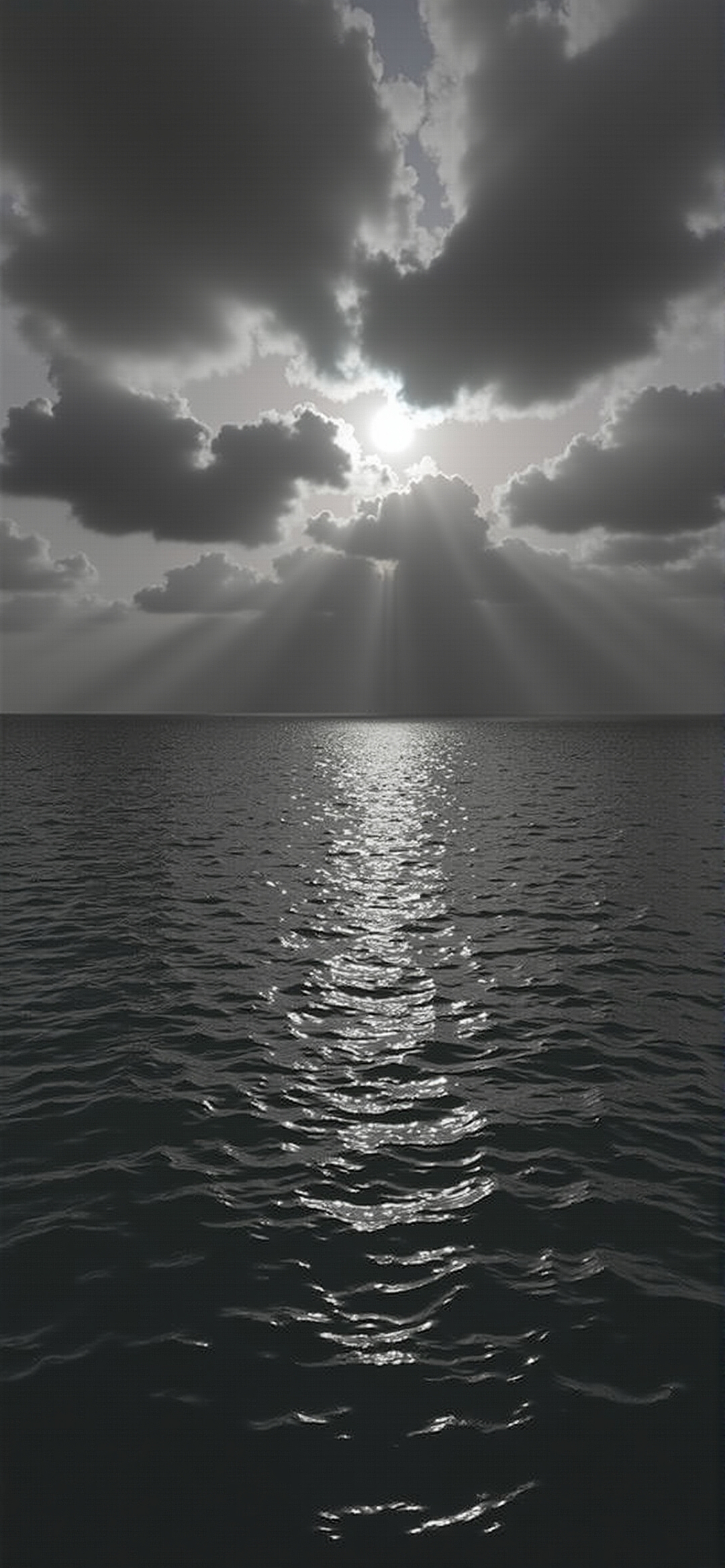 这张照片拍摄的是一个戏剧性的海洋场景,太阳冲破了黑暗、阴沉的云层。阳光被捕获向下辐射,明亮地反射在波纹般的水面上。低角度的镜头放大了戏剧性的效果,强调了天空的浩瀚和自然的力量。图像以单色调色板呈现,增强了对比度,创造了一种阴郁但令人敬畏的氛围。