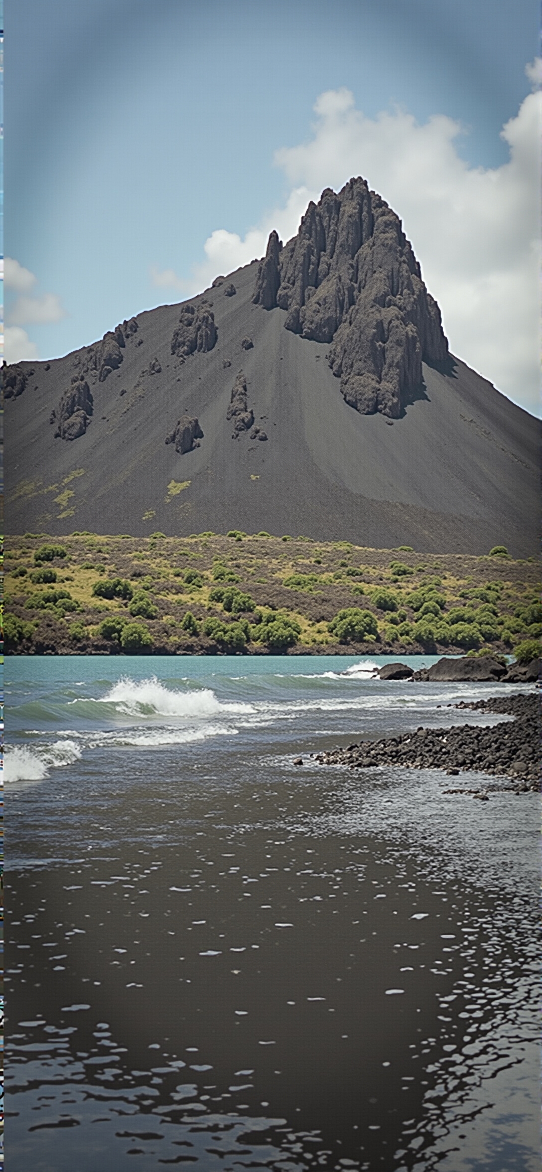 这是一张荒凉的火山景观照片。前景中的黑色沙滩与绿松石色的湖水或海洋相遇,那里温柔的海浪正在破碎。水面上布满了涟漪和天空的倒影。一片充满活力的绿色植被横跨中景,与深色的火山岩和沙子形成鲜明对比。在背景中占主导地位的是一座高耸的火山高峰,露出的是参差不齐的岩石。酒体呈现黑色和深灰色的混合色调。上面的天空是淡蓝色的,暗示着多云的一天。