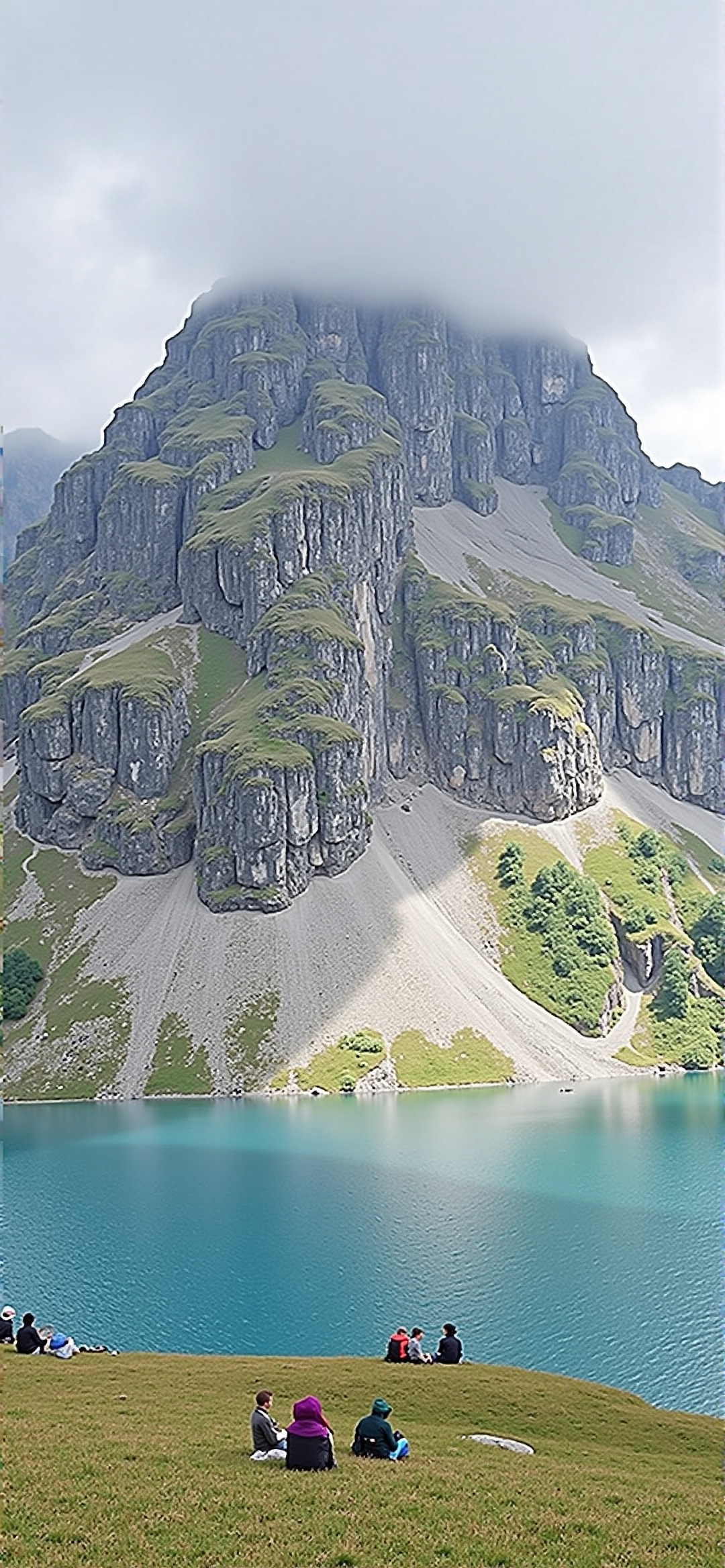 令人惊叹的山间湖景照片。一个戏剧性的,岩石山部分笼罩在雾中,从一个充满活力的绿松石湖的岸边雄伟地升起。山坡上崎岖的灰色悬崖和片片葱郁的绿色植被形成了迷人的对比。在前景中,几组徒步旅行者正坐在缓缓向湖边倾斜的草地上,欣赏着这令人叹为观止的景色。这张照片捕捉到了阿尔卑斯山风景的宁静之美,以及它对自然爱好者的吸引力。