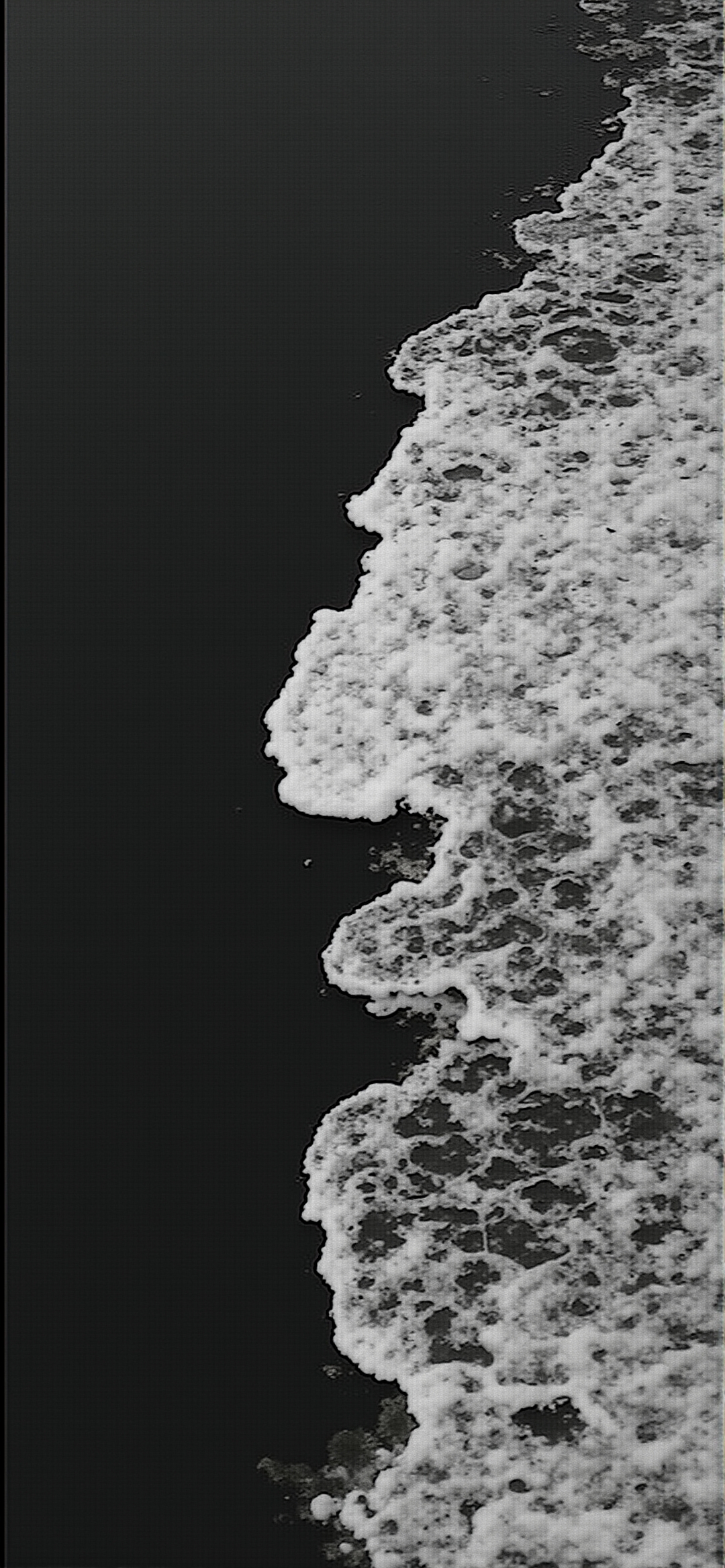 深色的海水和白色的浪花形成鲜明对比的照片。水是深的,墨黑的,可能是为了这种暗色调而编辑的。海泡沫是明亮的白色,创造了强烈的视觉对比。这张照片是从上面拍摄的,俯视着水面,海浪沿着画面的右侧垂直延伸,几乎像一个抽象的边界。这种构图强调了泡沫与平滑水面的对比和质感。