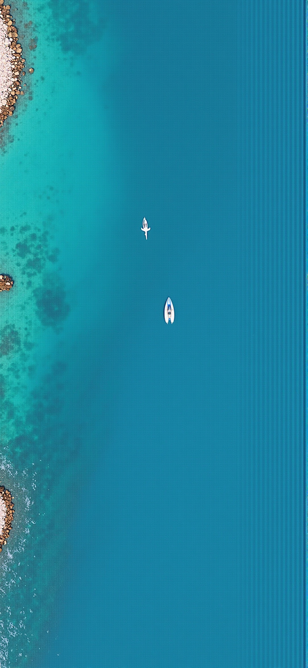 从高空俯瞰的空中视角拍摄的充满活力的蓝色海洋。这张照片展示了广阔的海洋,表面有轻微的纹理,可能是由于微风或洋流。两艘白色的小船在蓝色的衬托下显得格外显眼:一艘帆船位于中心位置,另一艘较小的物体,可能是一块桨板或一个漂浮着的人,靠近左侧边缘。沿着最左边可以看到一条带有白色岩石的海岸线,这是海岸线。图像的右三分之一以稍微较深的蓝色竖线的独特模式为特征,可能表明图形元素或反射。这张照片唤起了宁静和大自然的浩瀚。