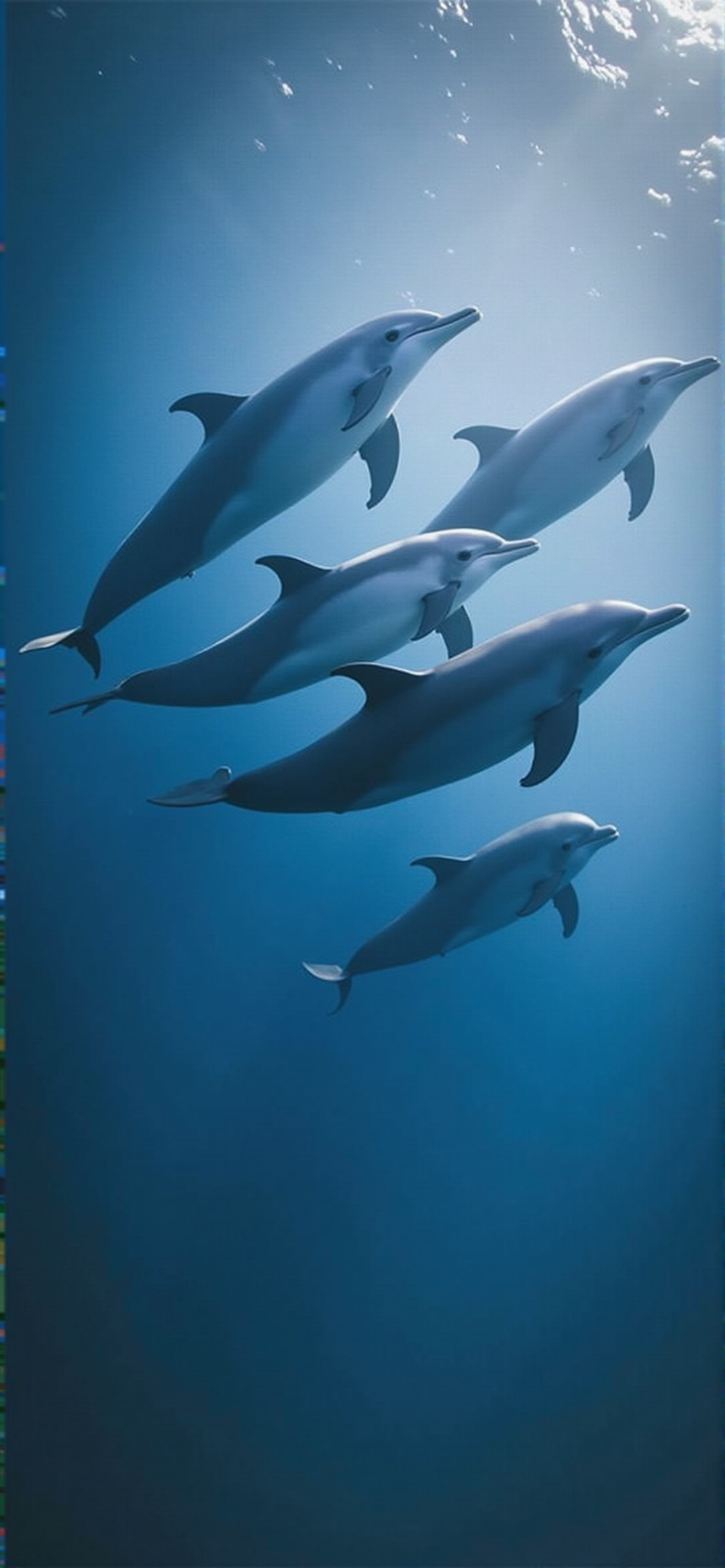 五只海豚在清澈的蓝色海水中排成垂直队形游泳。海豚是浅灰色的,当它们在水中移动时显得圆滑而优雅。从上面可以看到太阳光线,在海豚身上投射出一种飘渺的光芒。这张照片的拍摄角度略低于水面,捕捉海豚向上游动的过程。背景是深而均匀的蓝色,表明深水。这张照片唤起了一种和平与宁静的感觉,突出了这些海洋动物在自然栖息地的美丽和优雅。