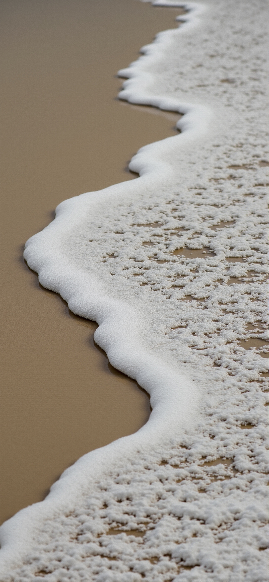 当波浪轻轻地冲到岸边时,一个波浪边缘的特写照片。白色泡沫的海浪在光滑的棕褐色沙滩上形成了精致的蕾丝图案。浅景深模糊了背景,将观众的目光吸引到水边的复杂细节上。中性的调色板和柔和的灯光唤起了一种宁静祥和的感觉。