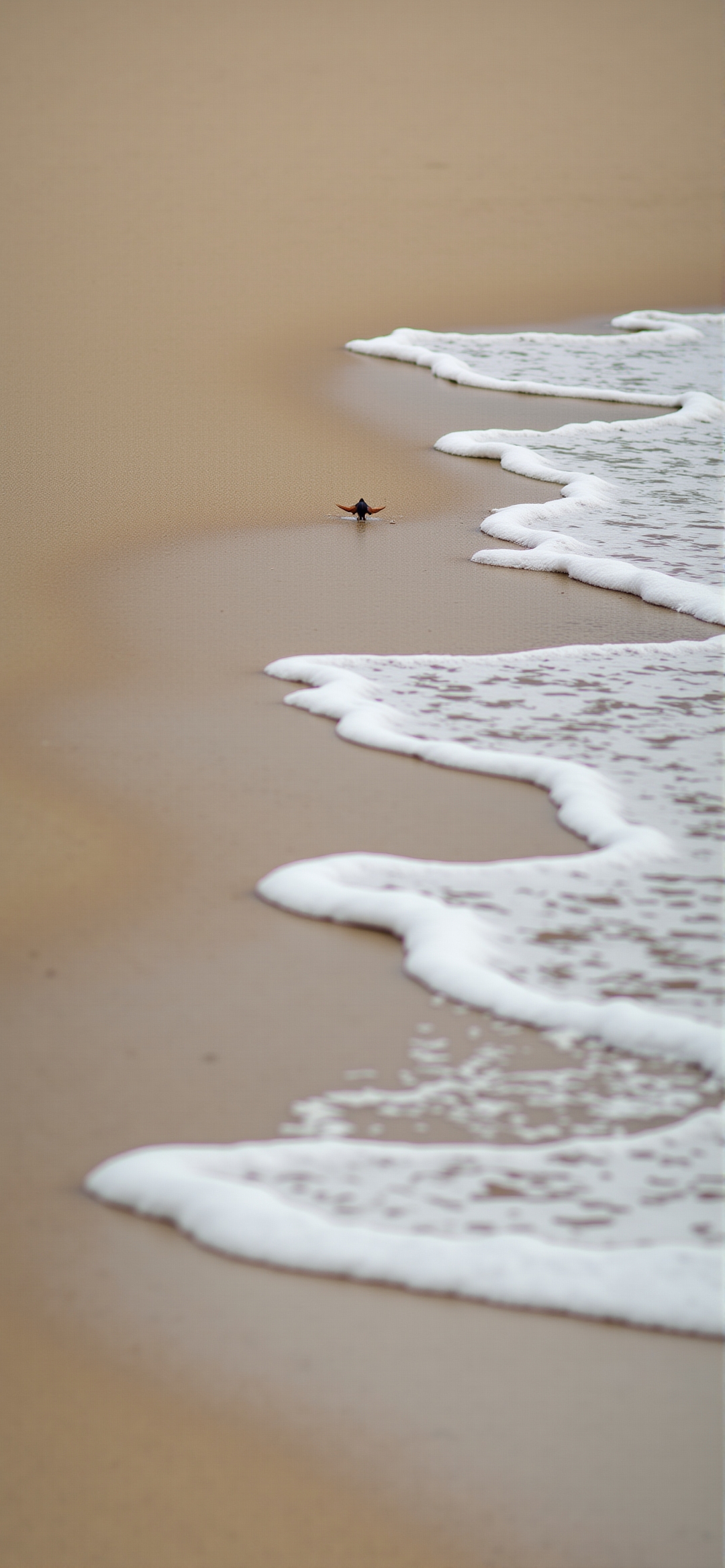 宁静海滩景象:波涛轻拍米色沙滩,小螃蟹静立海浪边缘
