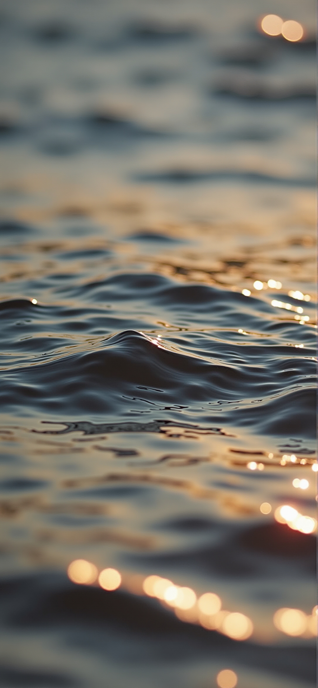 轻轻荡漾的水的照片。这幅图像被裁剪得很近,捕捉到了表面上光与影的相互作用。海水是深蓝灰色的,在夕阳的照耀下呈现出温暖的金色。焦点很浅,创造了一种梦幻的、飘渺的效果。散景可以在失焦区域看到,那里的太阳反射的水。整体的心情是宁静和宁静的。