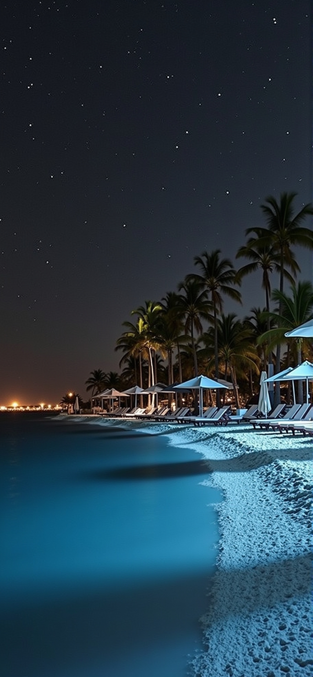 宁静的海滩夜景的照片。这张照片是从一个低角度拍摄的,展示了白色的沙滩、绿松石般的海水和一排棕榈树在繁星点点的夜空下的剪影。空的躺椅和白色的雨伞整齐地排列在一起,暗示着一种宁静而诱人的氛围。水面平静,反射着月光,营造出一种和平与安宁的感觉。图像的整体色调是冷静和诱人的,唤起一种放松和逃避的感觉。长曝光摄影技术被用于捕捉水的运动,为场景增添了梦幻和空灵的品质。