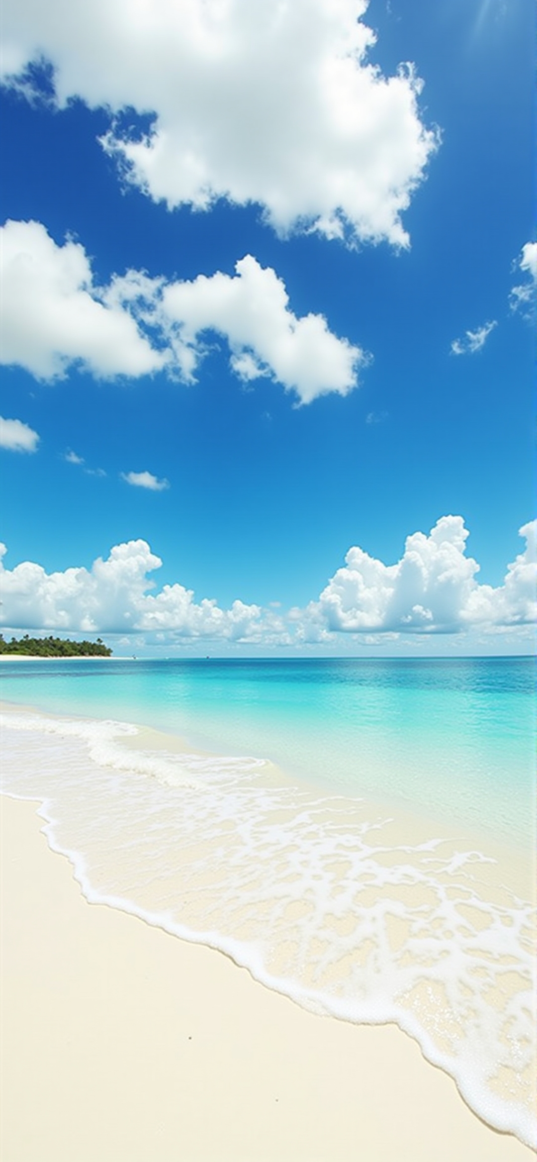 阳光明媚的日子里,原始的热带海滩的照片。这张照片是从低角度拍摄的,强调了天空的浩瀚和海岸的诱人的广阔。前景的特点是一大片白色的沙滩,亲吻着温柔,清澈的绿松石水的泡沫波。地平线上是一个郁郁葱葱的小岛。蔚蓝的天空,点缀着蓬松的白云,占据了画面上方三分之二的部分。这幅画散发出宁静的气息,唤起了一种田园诗般的天堂感。