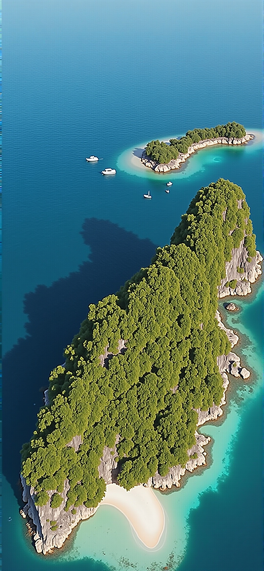 从鸟瞰角度拍摄的郁郁葱葱的绿色岛屿的照片。该岛拥有茂密的生机勃勃的绿色树木和植被,与周围蔚蓝的海水形成鲜明对比。它的岩石,不规则的海岸线包围着一个僻静的,原始的白色沙滩,形状像一个新月。蓝绿色的海水露出了海底,点缀着几艘白色的小船,暗示着这是一个受欢迎的旅游目的地。头顶清澈的蓝天增强了整个画面田园诗般的宁静氛围。