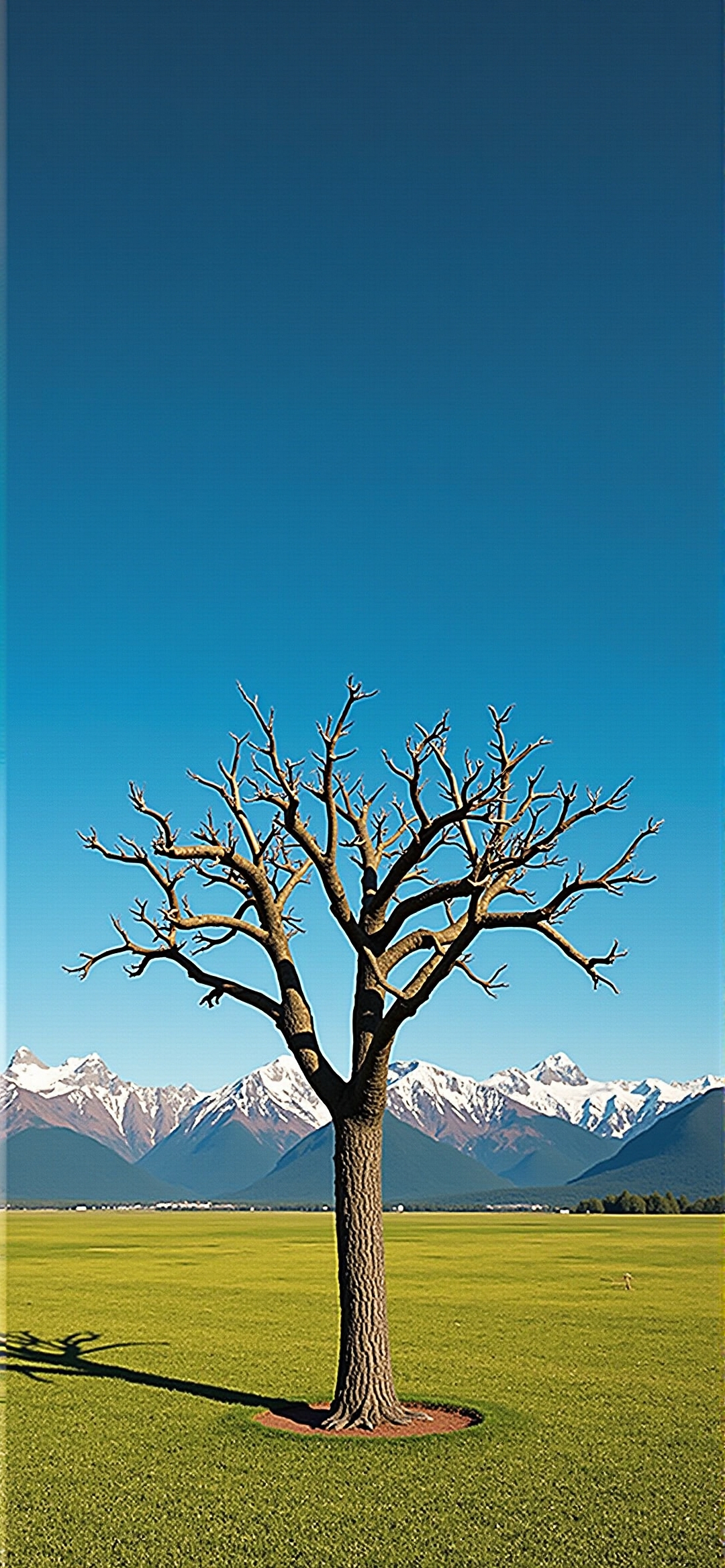 在生机勃勃的绿色田野中央,有一棵孤零零的光秃秃的树。在明亮的蓝天和远处雄伟的雪山的衬托下,这棵树挺拔地矗立着。那棵树在田野上投下长长的阴影,突出了太阳的低角度。这幅画唤起了一种宁静和孤独的感觉,广阔的风景使那棵孤独的树相形见绌。构图简单而有力,树的垂直线与山脉和地平线的水平线形成对比。