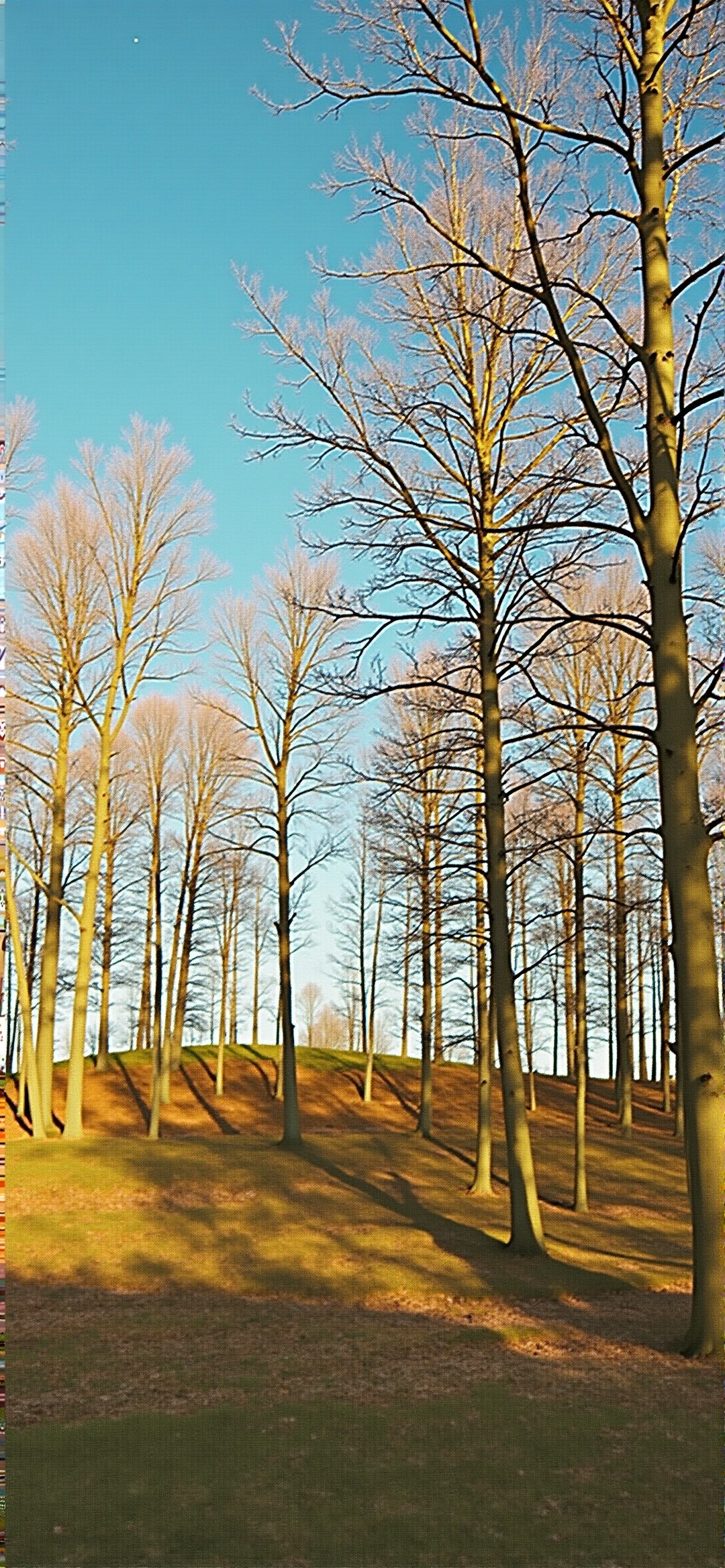 阳光下的冬日树影:静谧山侧林的光影魅力