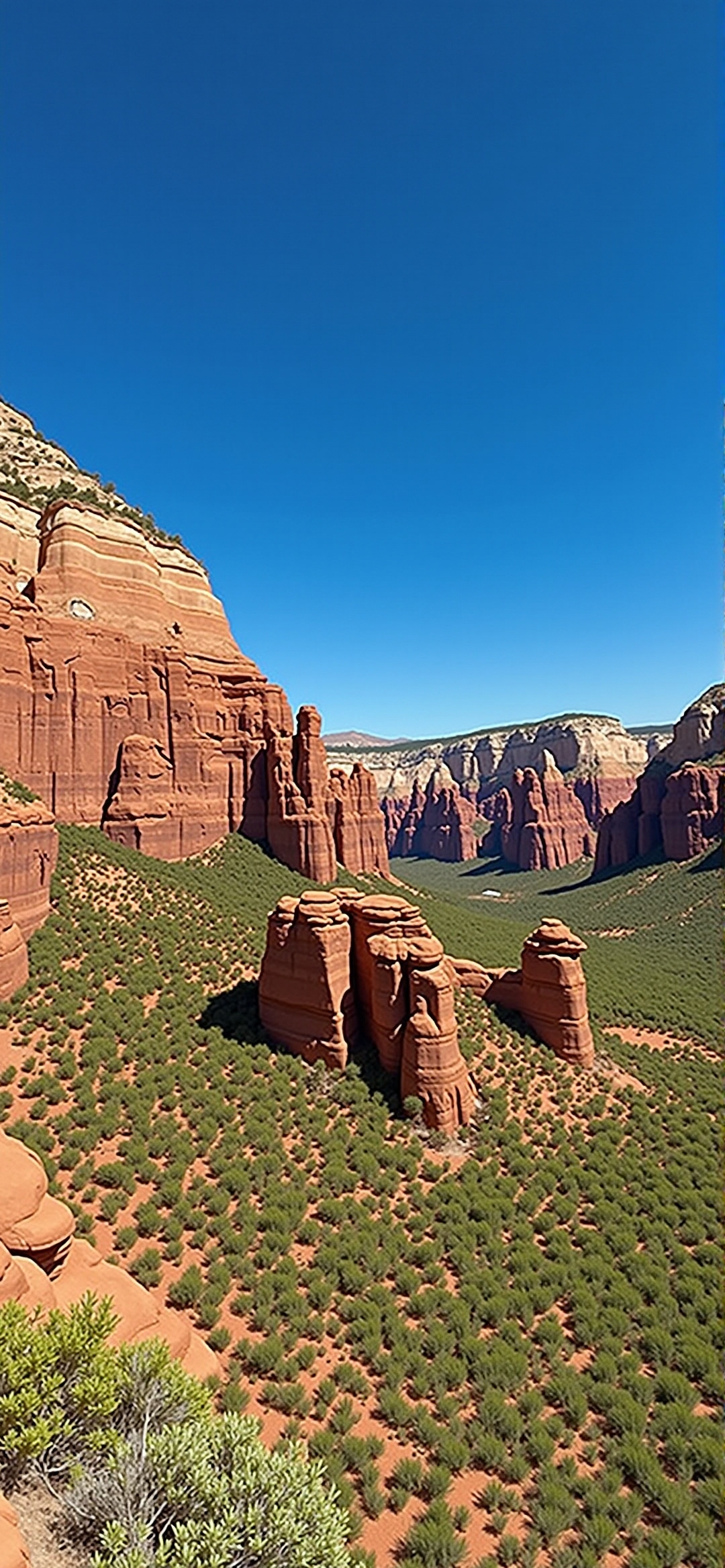 在明亮的蓝天下,以高耸的红色岩层为主的充满活力的沙漠景观。呈现出不同色调的红色和橙色的地层,散布在整个场景中,一片郁郁葱葱的绿色沙漠植被覆盖着地面。这张照片是从一个很高的有利位置拍摄的,展示了该地区的广阔和形成的规模。鲜艳的色彩和晴朗的天空使照片的画质如画,突出了自然环境的美丽。