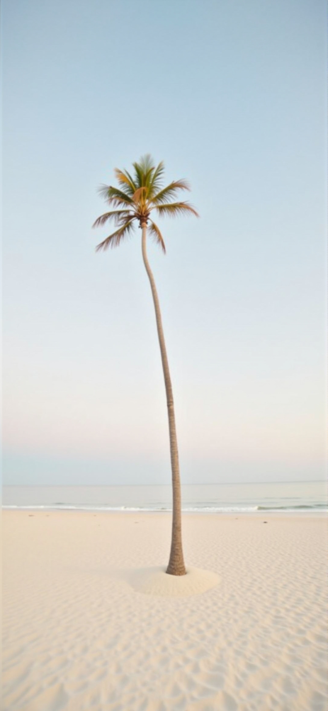 在一个僻静的海滩上,一棵孤零零的棕榈树的照片。这棵树有着细长弯曲的树干和郁郁葱葱的绿叶,是照片的焦点,在淡蓝色天空的宁静背景下,它高高矗立着。沙滩在前景中延伸,未被破坏,原始,通向远处蓝绿色海洋的温柔波浪。这幅构图强调了这个田园诗般的热带天堂的宁静与孤独。柔和的漫射光线表明这张照片可能是在清晨或傍晚拍摄的。