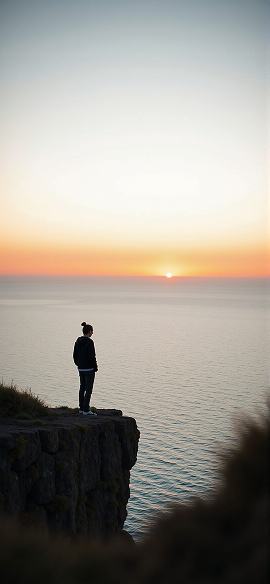 悬崖边女子凝望海上落日余晖,彰显自然之美与宁静孤独