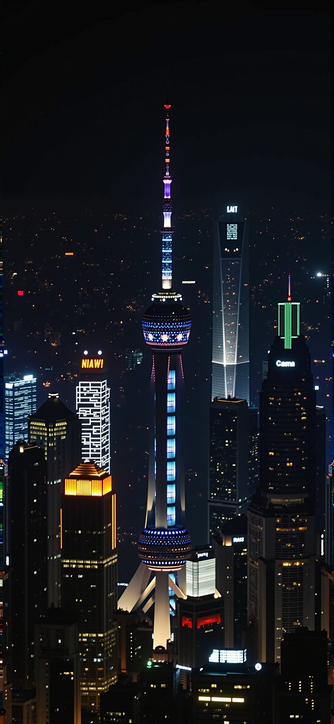 中国上海东方明珠塔的夜景。在熙熙攘攘的城市景观的背景下,这座塔被充满活力的彩色灯光照亮。这张照片是从一个很高的有利位置拍摄的,展示了这座塔的高度和对周围摩天大楼的支配地位。建筑的灯光创造了迷人的城市灯光挂毯,而深蓝色的夜空进一步增强了视觉冲击力。构图突出东方明珠塔作为焦点,捕捉上海天际线的能量和现代性。