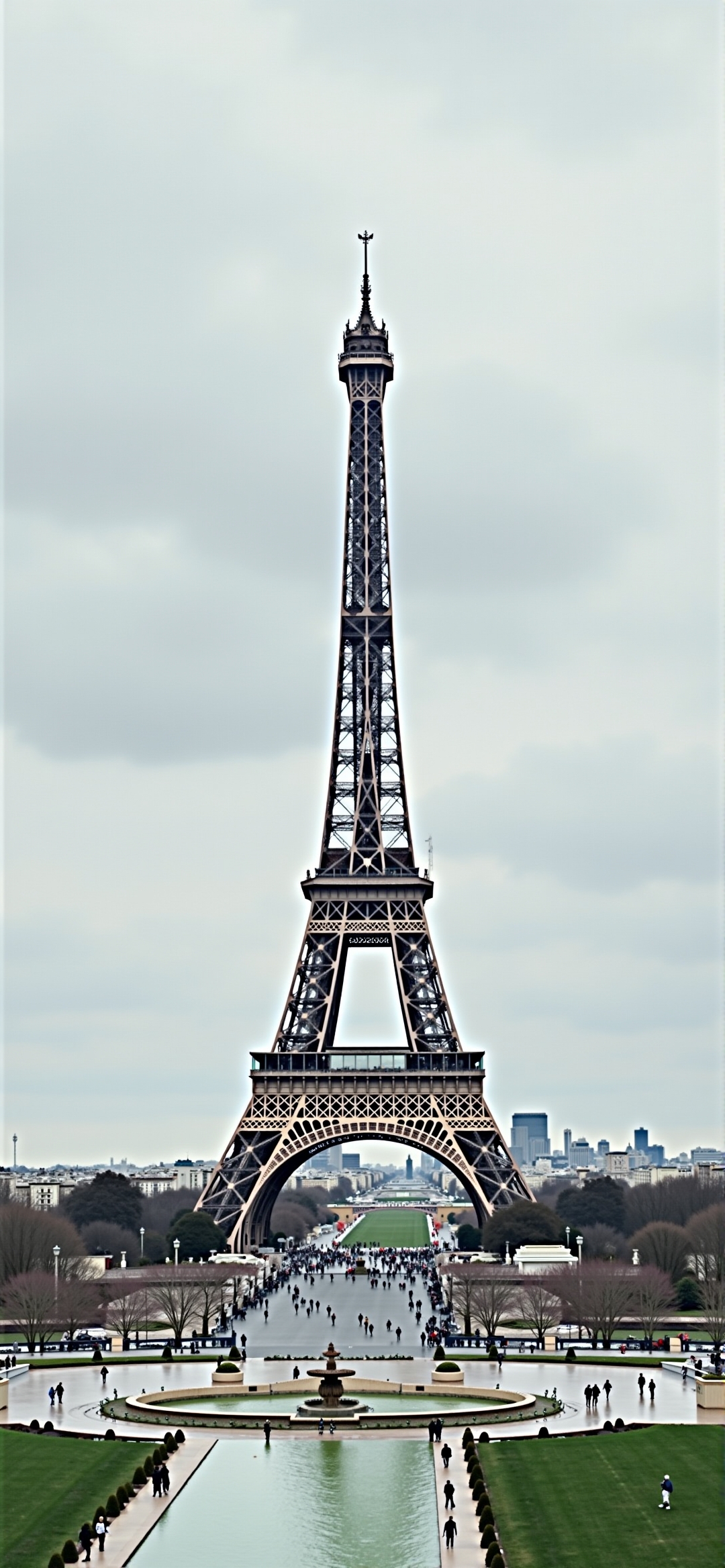 在一个阴天,法国巴黎埃菲尔铁塔的照片。这座标志性的塔占据了画面的中心,在柔和的天空下庄严地升起。从地面略微升高的角度来看,可以清晰地看到塔楼令人印象深刻的结构和复杂的网格结构。一条宽阔的大道从塔的底部延伸出来,挤满了人,强调了它的巨大规模。带有中央喷泉和倒影池的观赏花园占据了前景,为场景增添了一丝宁静。在远处,巴黎的天际线依稀可见,完成了典型的巴黎景观。