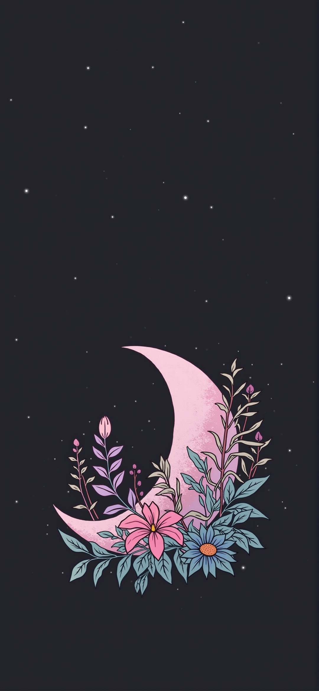 粉色梦幻花卉新月插画,营造静谧星空氛围