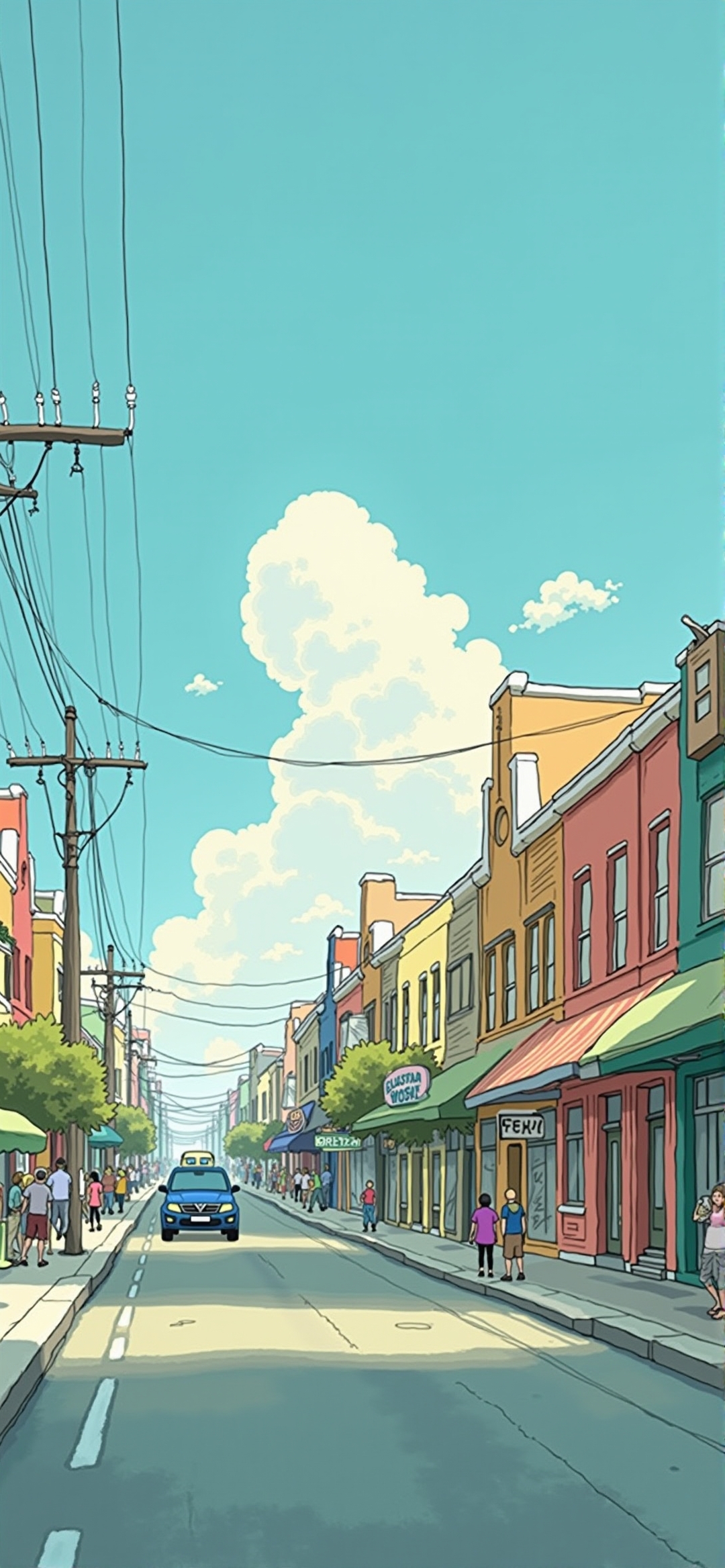 这是一个在阳光明媚的日子里熙熙攘攘的城市街道的渲染图像。这个视角是从街道上俯瞰道路的中心。色彩缤纷的店面排列在街道两侧,遮阳篷延伸到人行道上。人们朝两个方向走着,一辆蓝色的汽车朝观众驶来。带电线的电线杆沿着街道的左侧延伸。一片蓬松的大云飘过明亮的蓝天。图像的整体风格是卡通和邀请,干净的线条和鲜艳的色彩。