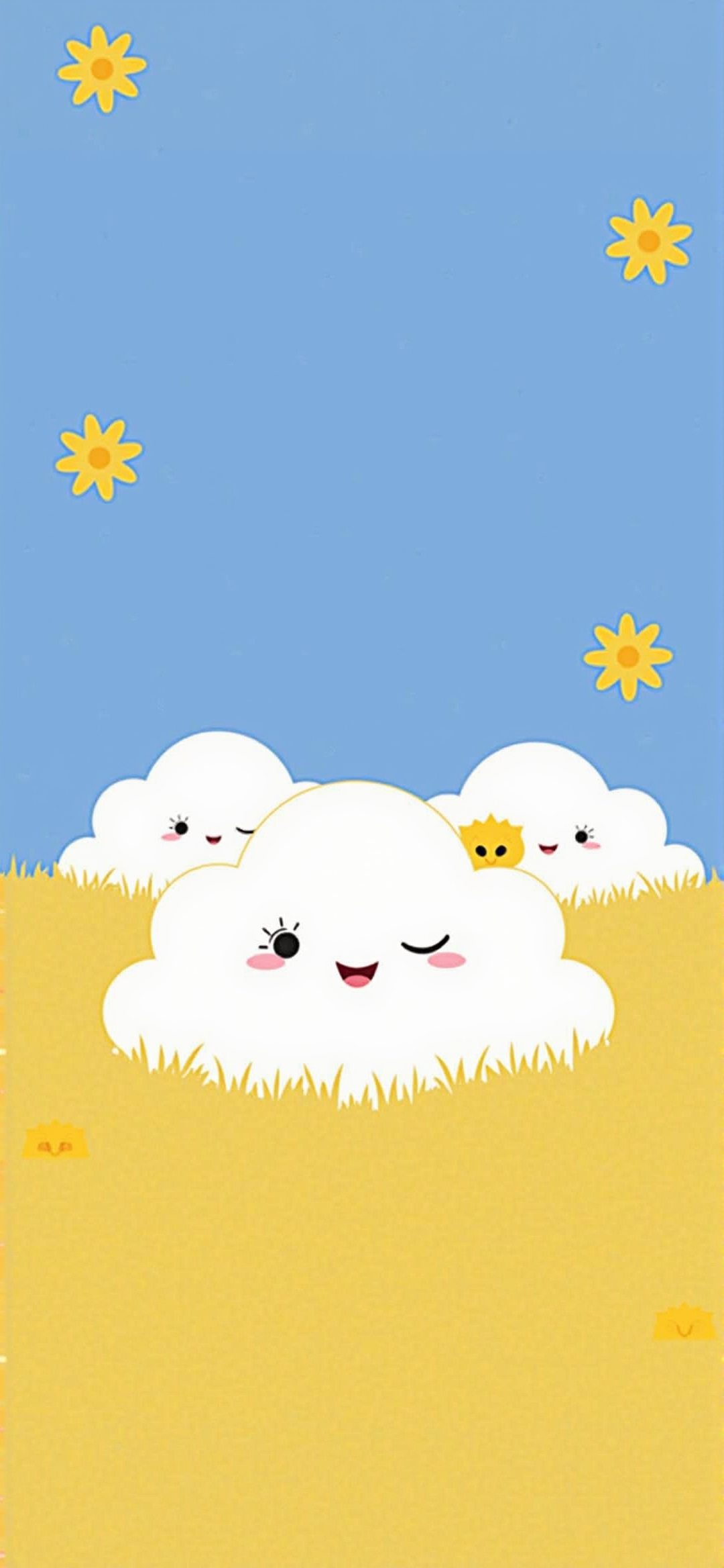这是一幅异想天开的插图,以一组拟人化的云为背景,映衬着明亮的蓝天。白云,用白色描画,有着简单的特征,比如红润的脸颊和微笑的嘴巴,依偎在一片高大的黄草中。中间最大的云在闪烁,为图像增添了一种俏皮的色调。四朵风格化的黄色花朵散落在蓝色的背景上,进一步强调了插图的欢快和轻松的本质。整体构图简单友好,可能会吸引年轻观众。